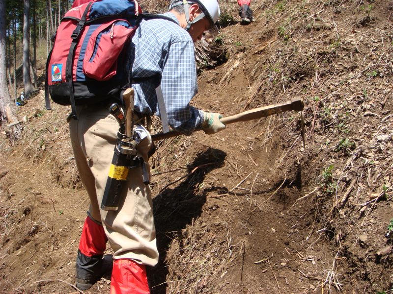 先ずは道つくりである。自分の足場を確保して30Cm幅くらいの道を作る。ずるずるとすべり足場の確保が大変だ。植樹祭には子供も参加するのでしっかりした道を作っておかなければならない。落石がないように浮石も取り除いておかなければならない。