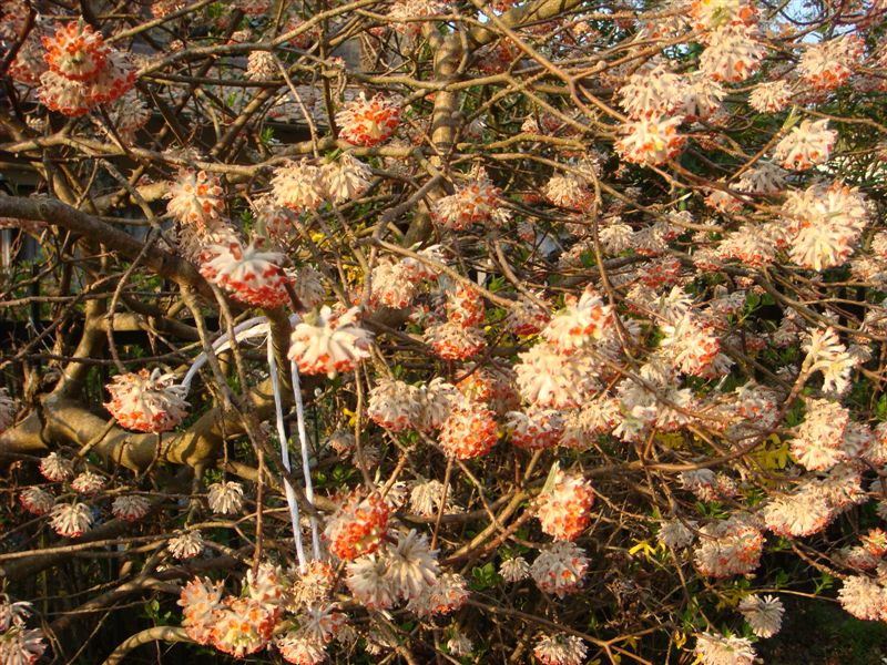 ミツマタの花ですが黄色はいつも見かけますがオレンジの花はめづらしいですね。