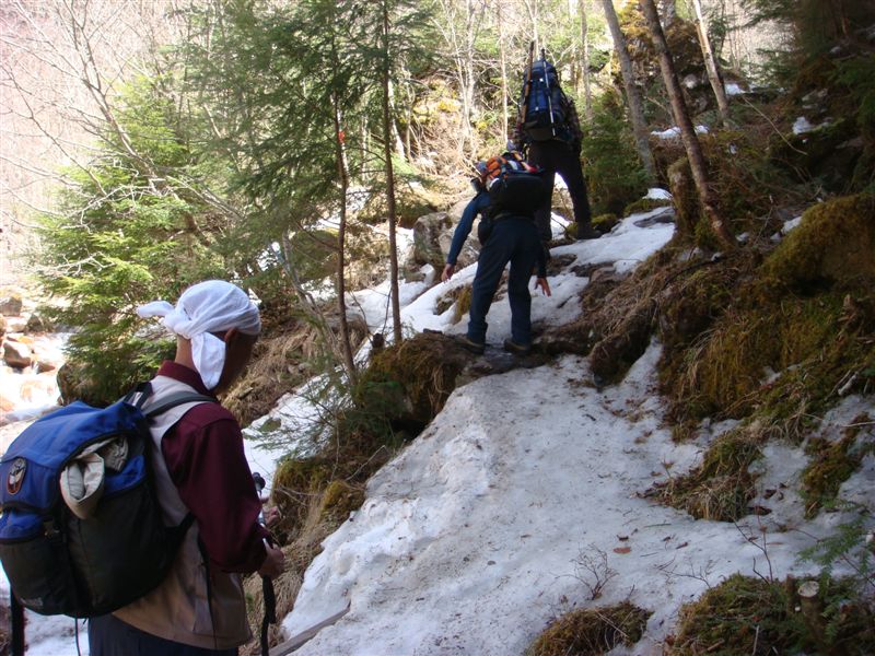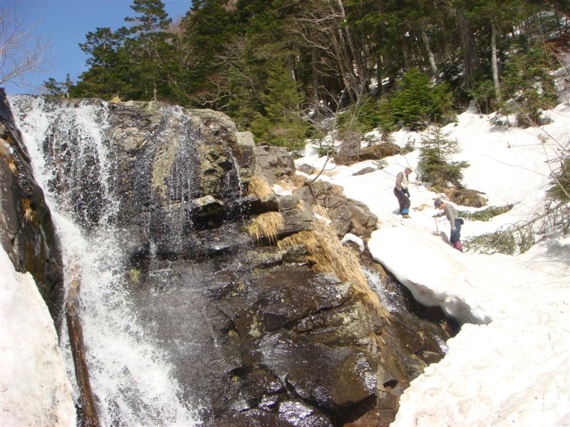 ジョーゴ沢を入りF1の滝まで行ったが雪が腐っていてこれ以上登るのはつらいのでF2はやめて引き返すことにした。