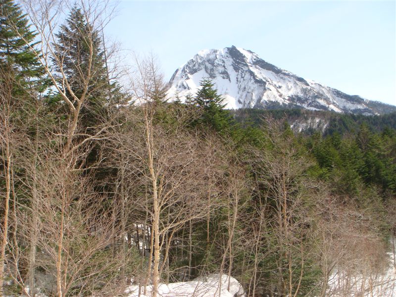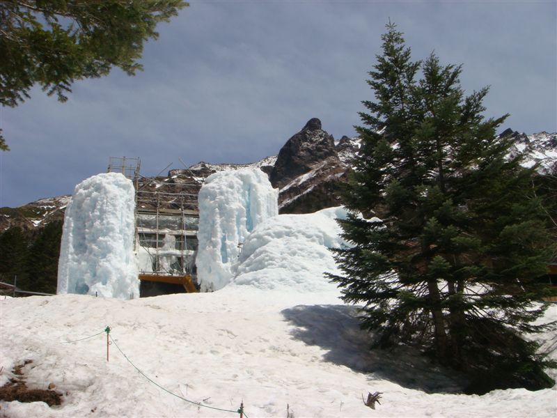 4分くらい歩くと赤岳鉱泉が見えてきた。名物の氷柱がまだ融けないで立っている。厳冬期にはアイスクライムを楽しむ人たちで賑わっていたのだろうが取り壊し始めていた。