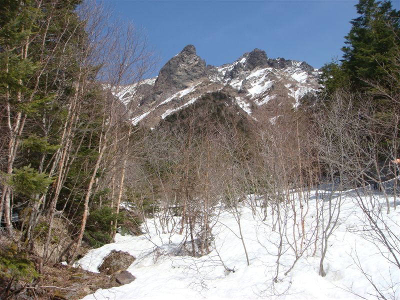 美濃戸山荘に車を止め林道を歩いて車道終点(北沢)堰堤まで約1時間歩くと登山道に入る。堰堤からすぐ山道の日陰には雪があり凍っているところもあるのでアイゼンを装着して沢沿いを赤岳鉱泉まで登っていく。快晴で風もなく暑い。