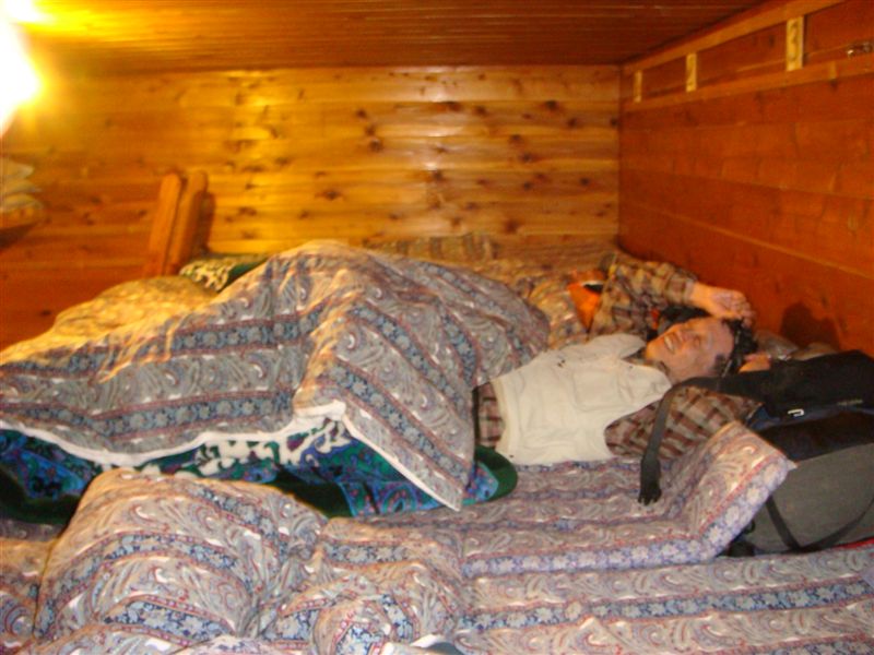 夕食を終えたらもうすることはない。アルコールもたっぷりとったので眠くなってきた。大部屋だがすいているのでロフトの通常6人の場所を4人で使わせてもらえたのでとても快適である。明日の朝食は6:30からである。