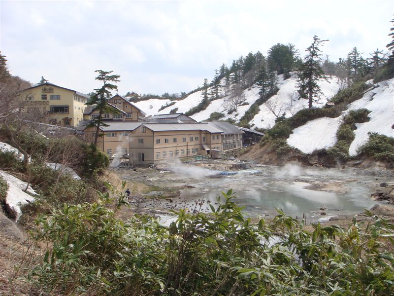 そして後生掛温泉到着。2月は雪に埋もれていたが今は周辺に雪が少し残っている状態であった。のんびり温泉に使って運転の疲れを取ろう。