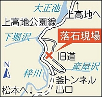 上高地に通じる県道の落石で蝶ヶ岳登山は中止になったがこの天気ではいかなくってよかった。落石は釜トンネル近くの旧道の石垣が崩れ新道に落ちたのだそうだ。
