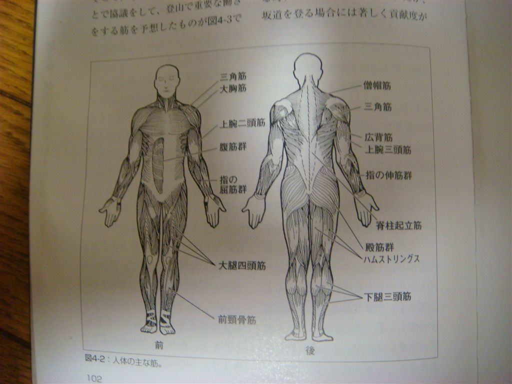 先ず、登山で使われる筋肉だがこれは左の写真を参照してください。(出展:「登山の運動生理学百科」)この写真をみれば登山の際に重要な働きをする筋が一目瞭然である。足の筋は歩く運動なので特に重要となり大腿四等筋が最重要だ。トレーニングによって大腿四等筋を強化すればバランスの向上や疲労せずに歩けるし膝関節痛の予防にもなる。次に重要なのが下腿三頭筋で、岩場や雪渓で負担が増す部分だ。そして、体の幹になる筋は腹筋と背筋でこのバランスが崩れると腰痛になりやすい。また、上半身の筋は重い荷物を背負うのに必要だ。体には沢山の筋があるが特に重要な筋肉を鍛えていくことが大事なようだ。明日は持久力に付いて纏めてみたい。
