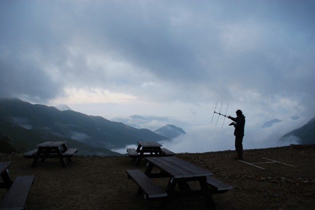 大天井ヒュッテ(ここ)の山小屋便りを見たら槍ケ岳の街道を猿を追っかけているグループが居ますと紹介されていた。どこのグループかと思ったら「槍ケ岳の猿」の取材に来ているNHK番組の制作集団とのこと。6年ほど前に一度NHKの番組で放映した事のある日本猿の生態を、再度制作し直すための取材班だそうです。西岳方面にて猿の集団に出会い、素晴らしい映像が撮れたようです。放映は来年になるようですが日程は決まっていないとの事。写真は数年前から猿の生態を調査している信州大学の教授により一匹の猿に発信機を取り付けてあり、その猿の動向をアンテナを向けて探しているところだそうです。