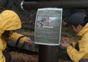 自然公園法で植物や土石の採取などを無許可で行うことが禁止されているのはご存知と思いますが石などはつい形の良いものなど拾ってきてしまうのが普通です。しかしこれも違法行為ですね。そんなニュースが出ていました。富士山ろくから溶岩を持ち去る登山客が後を絶たない中、九州地方在住の20歳代の女性が「富士山に返してほしい」と一時持ち帰った溶岩を富士山レンジャー(自然保護官)に郵送されてきて同レンジャーが溶岩を富士山に戻したそうだ。富士山ろくは富士箱根伊豆国立公園に指定、自然公園法で土石の採取などを無許可で行うことが禁止されている。九州から富士登山のツアーに参加し初めて富士登山を達成した喜びから、記念品として下山途中の7合目付近で直径3センチほどの溶岩5個を持ち帰ったが、帰宅した後、観光パンフレットを見て溶岩の持ち帰りが禁止されていることを知り、溶岩を返却し溶岩とともに「環境保全に役立ててほしい」と現金3千円が同封されていたそうだ。気が付いてもこのような方はまれでしょうね。国立公園内にある山に登ったら記念に石など持ってこないようにしましょう。溶岩を持ち去る登山客が後を絶たない富士山は持ち出し禁止を呼び掛けるポスターを設置(富士山5合目写真山梨日日新聞より借用)したそうだ。