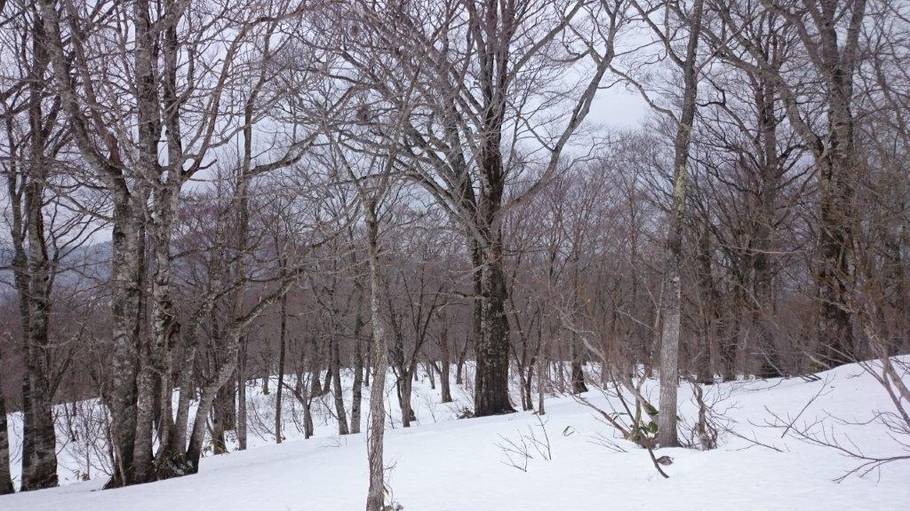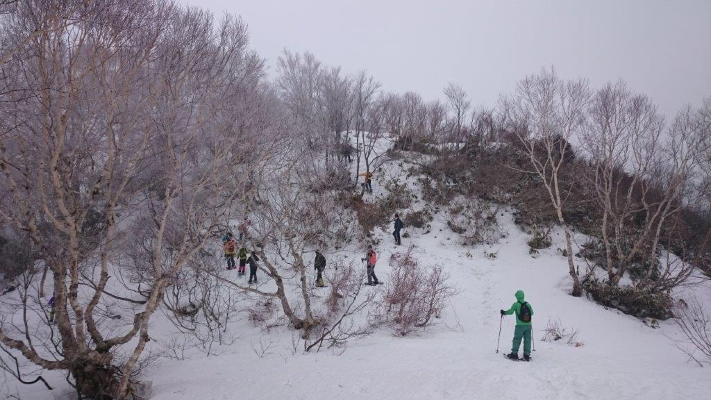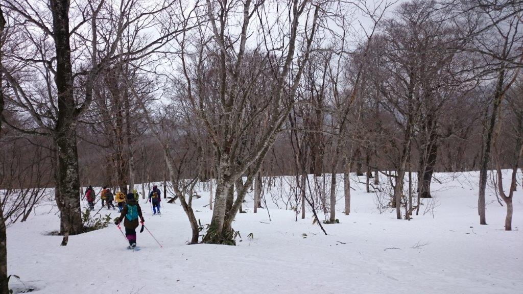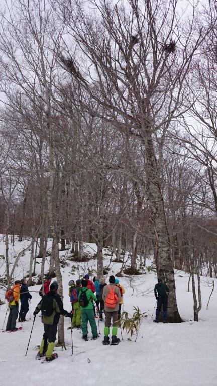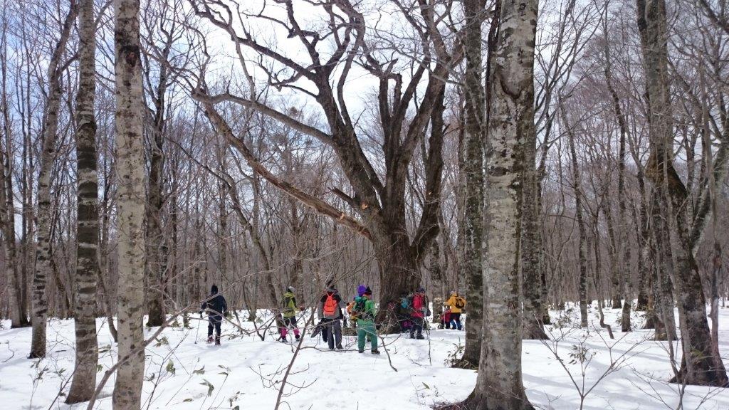 リフトに乗って鹿俣山へ登ります。最後は急斜面でスノシューで登るのに苦労しましたが全員登頂しました。そしてのんびりブナ林の中を下りながら宿に戻ります。