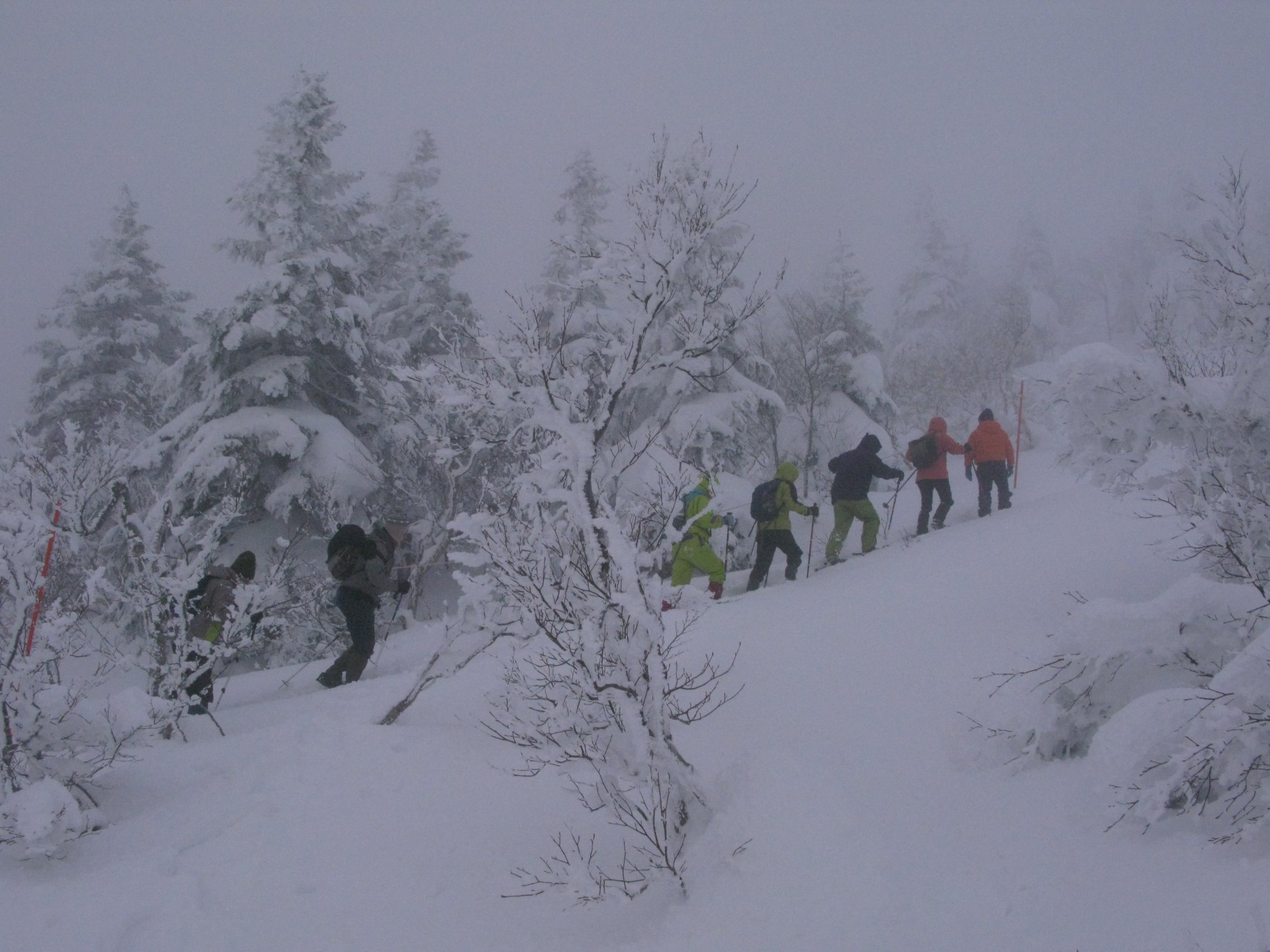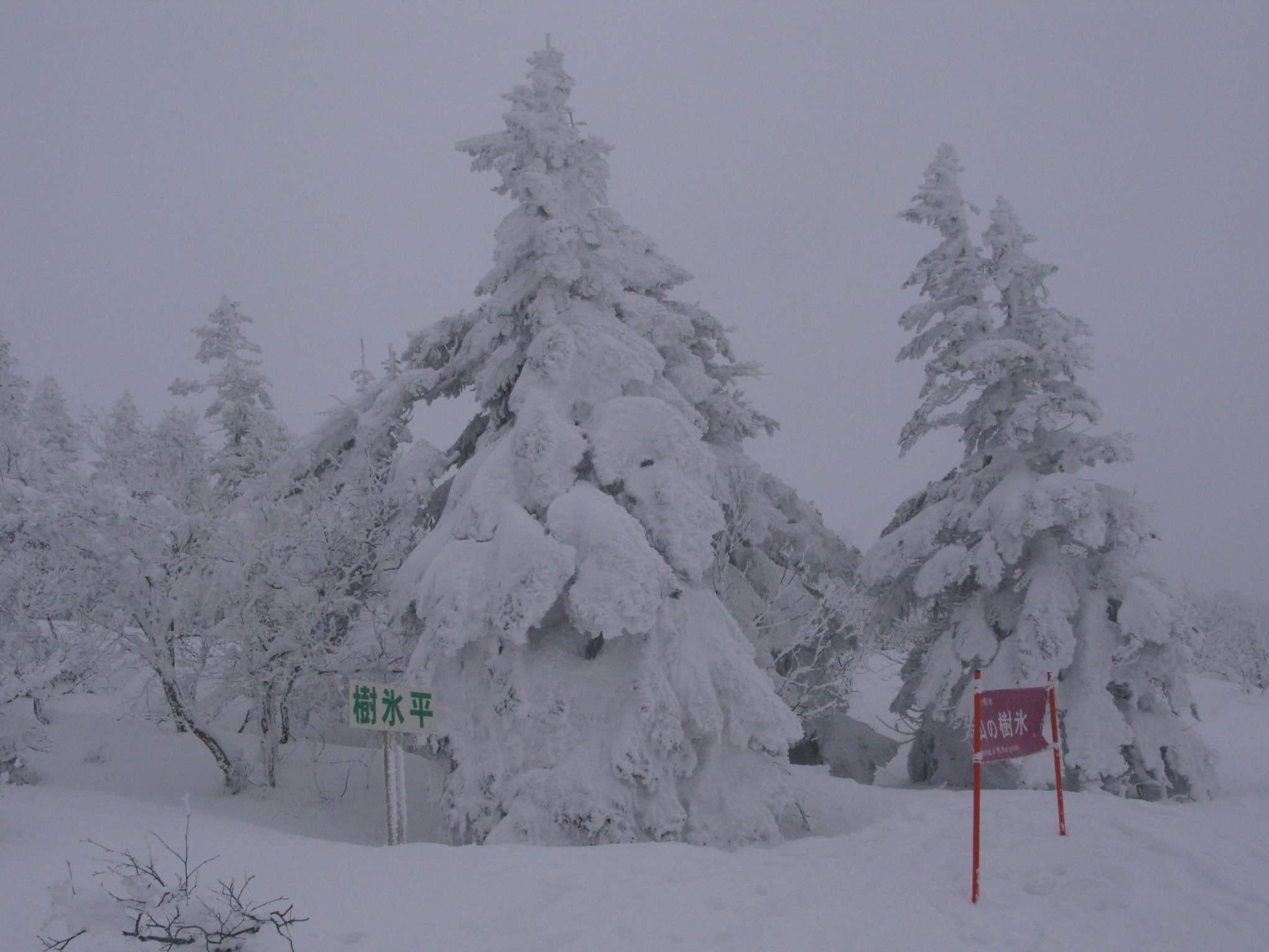 暖冬で雪が降らず、樹氷には物足りませんが数日前までは暖かくて雪がついていなかったそうです。アオモリトドマツに日本海からの雪が凍り付くためこの期の経常から雪が張り付くのだそうです。