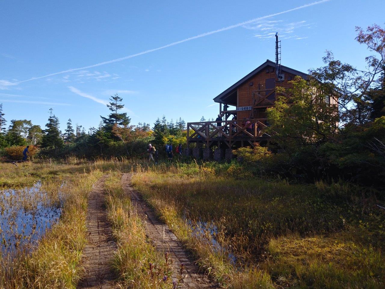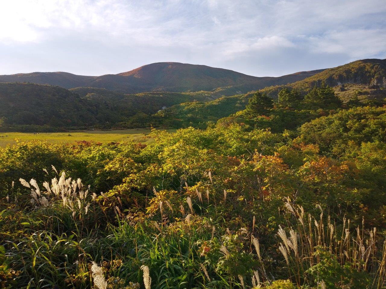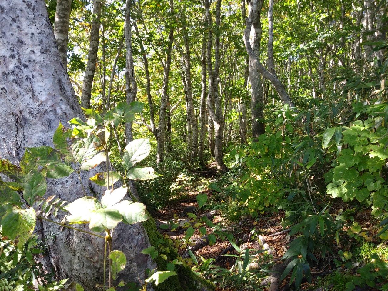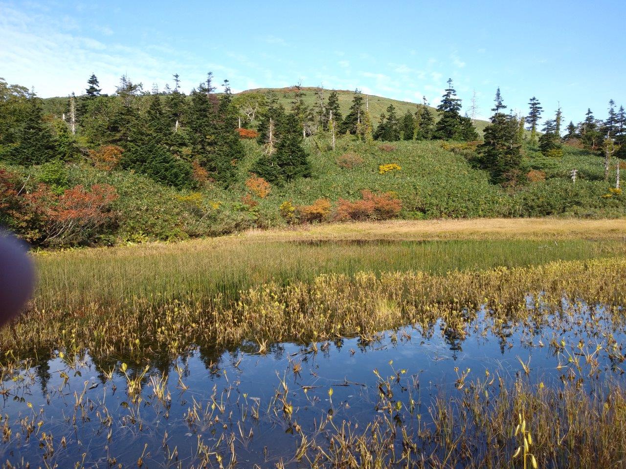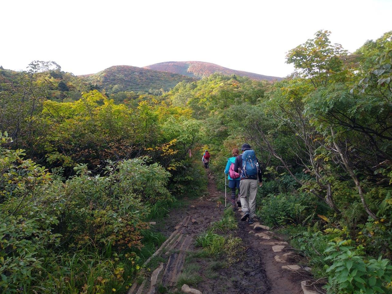 翌朝5:00起床し、6:00に登山開始です。苔花平の湿原を通り、昭和湖からの登山道が硫化水素ガスが出ておりこのルートが使えないため、自然探索路コースを登ります。
