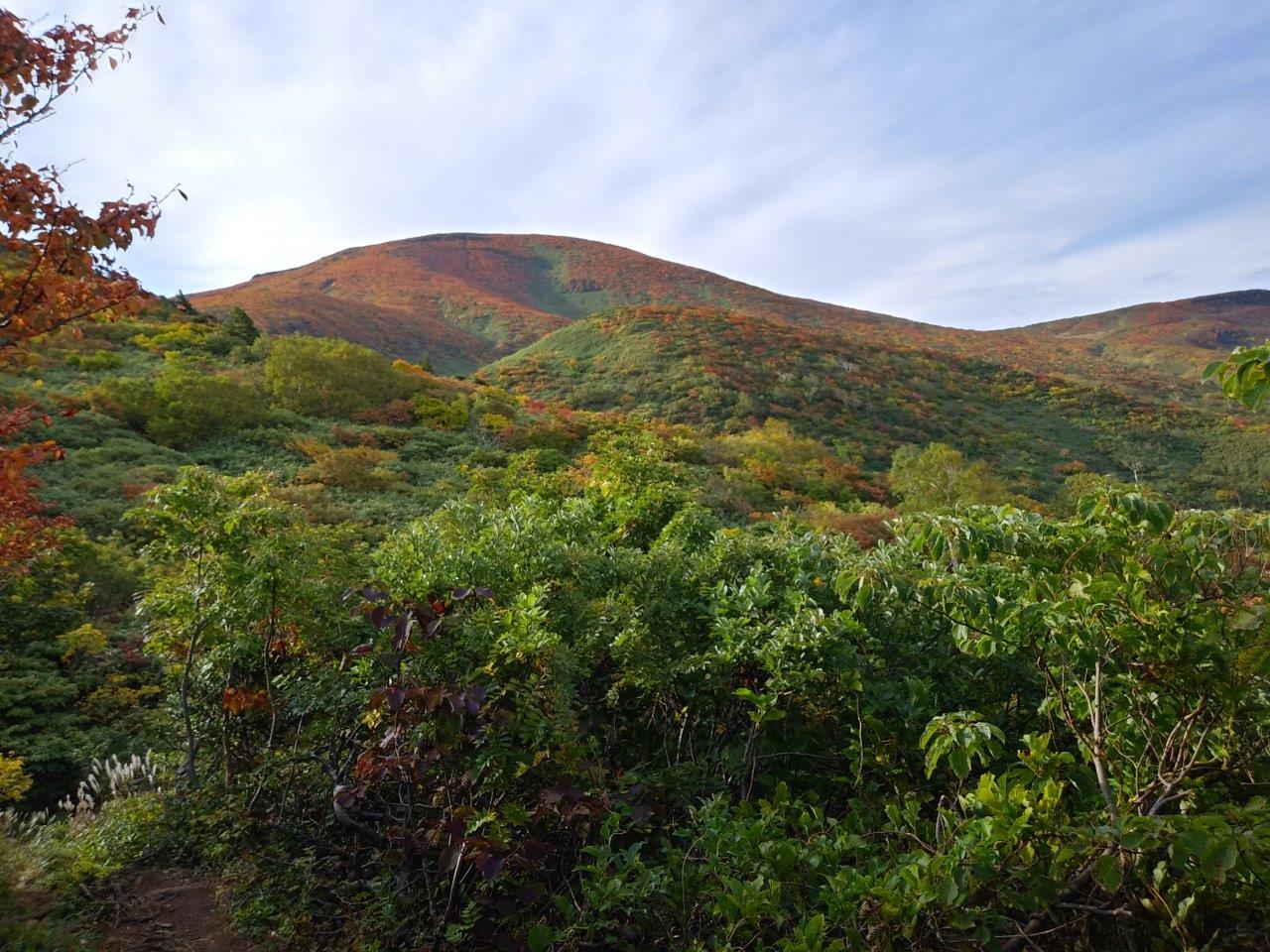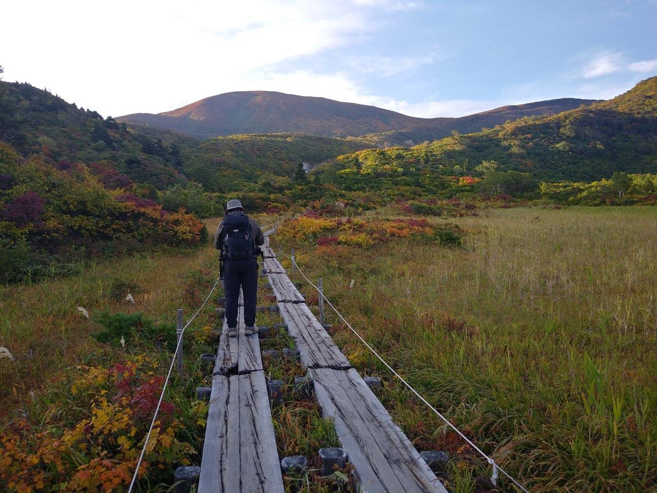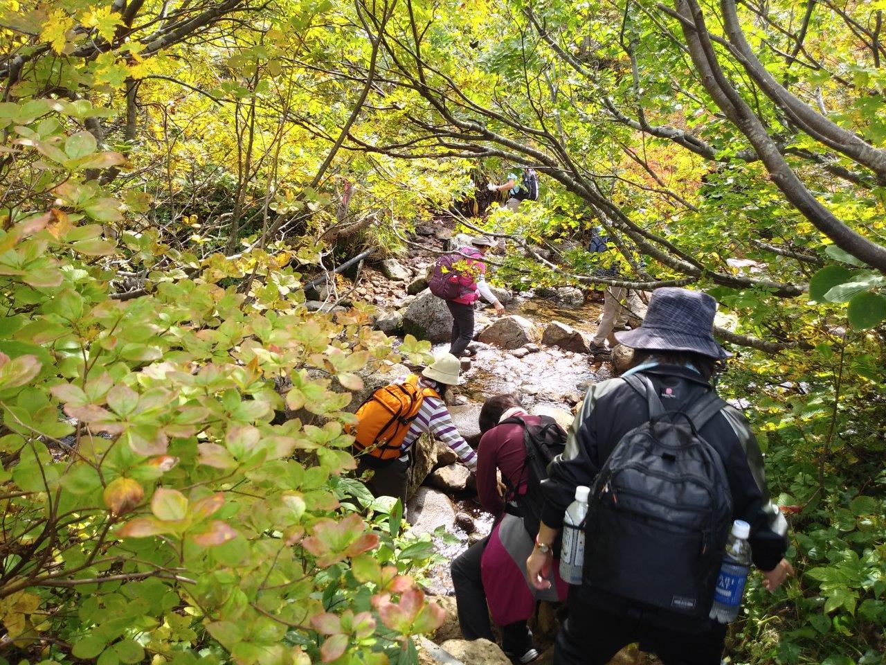 渡渉を2か所通過し、紅葉した栗駒山が見えてきました。産沼を過ぎると樹林帯を抜け紅葉が目に飛び込んできます。ここから山頂へは約1時間でしょうか。