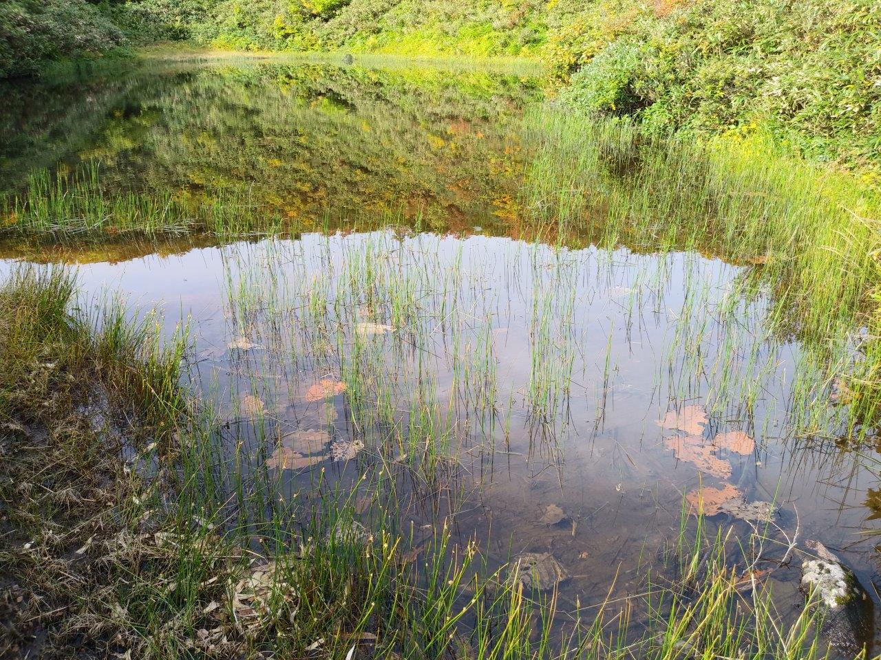 火山灰はまず、池の東側のいつもは枯れている部分にたまり始めた。その後、池にも流れ込み、埋まる面積は年々増加し、今年は西側に少し水が残る程度になってしまったそうだ。御嶽信仰の信者の中には、二ノ池を登拝の目的地とする人や水をくんで行く人がいる。御嶽山の魅力の一つなので、なくなってほしくはないけれど、これも自然の営みで見守るしかないののでしょうね。