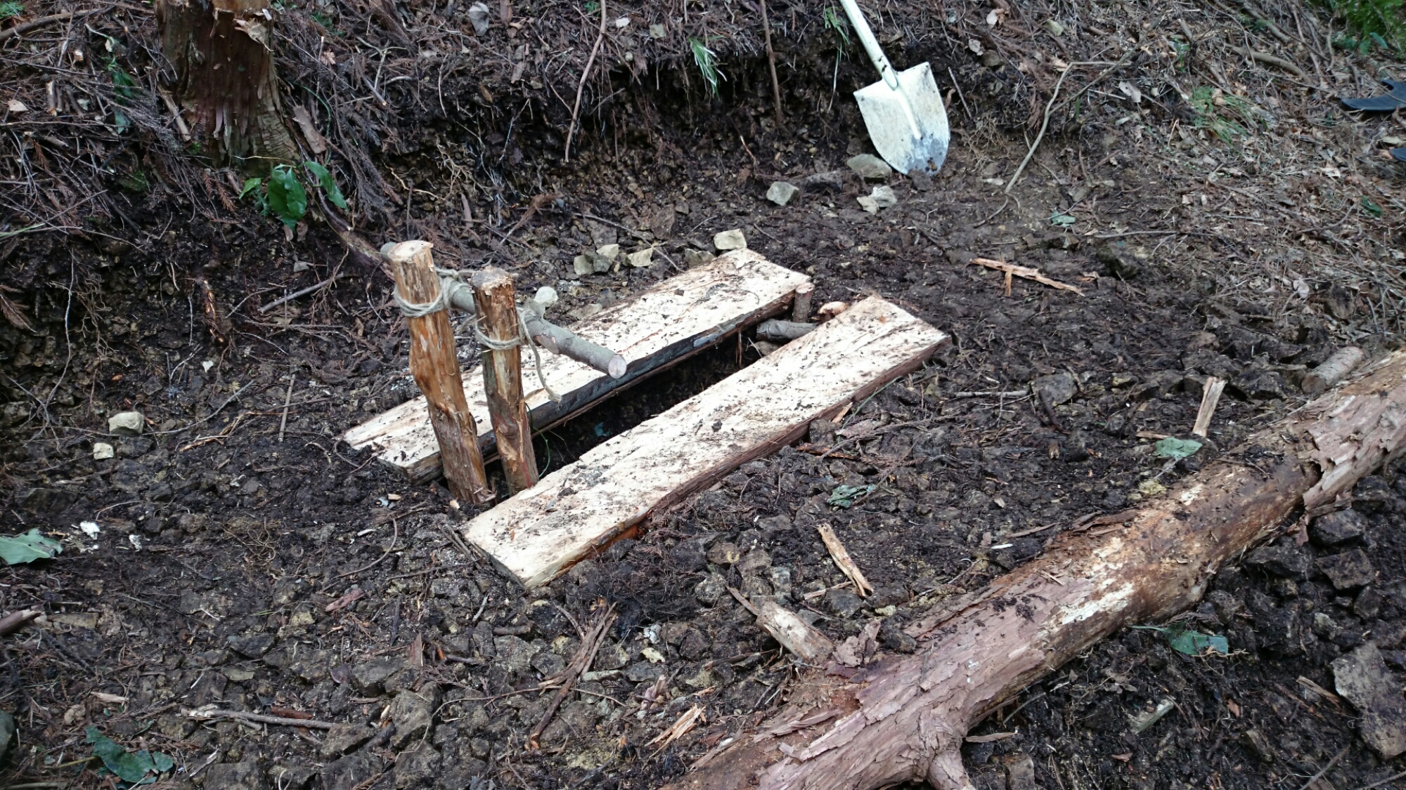 私は今回トイレ作りです。穴を掘って足場に丸太を半分に切ったのを渡して完成です。植樹祭前日にトイレを覆うテントをかぶせます。