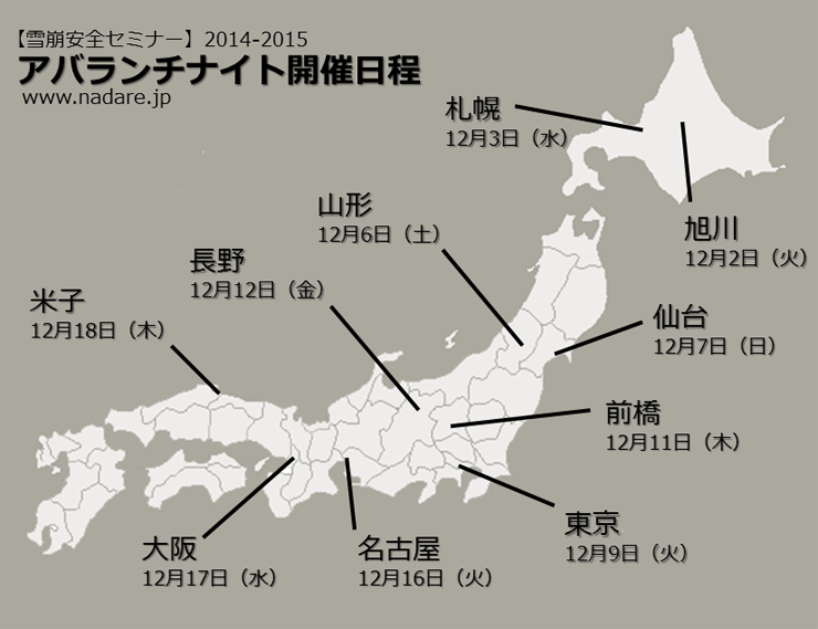 今年は全国10都市で開催され旭川と米子は初開催、前橋はしばらくぶりの開催となっている。詳細日程と開催場所・日時はHP(こちら)http://nadare.jp/2014/10/2015.htmlを参照してください。近年雪崩の事故が多くなっていますので雪崩リスクの軽減方法や、事前の情報入手方法など知っておくのが大事ですね。