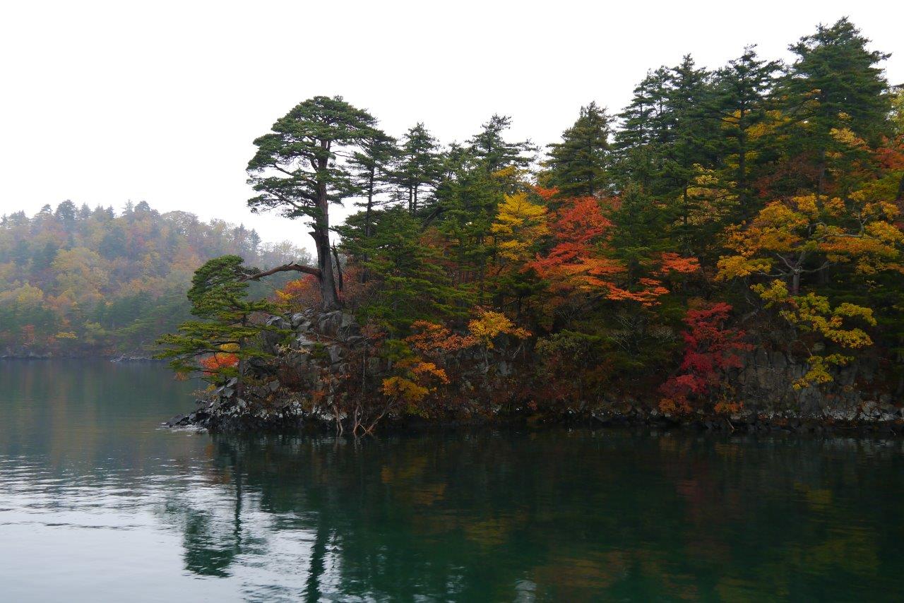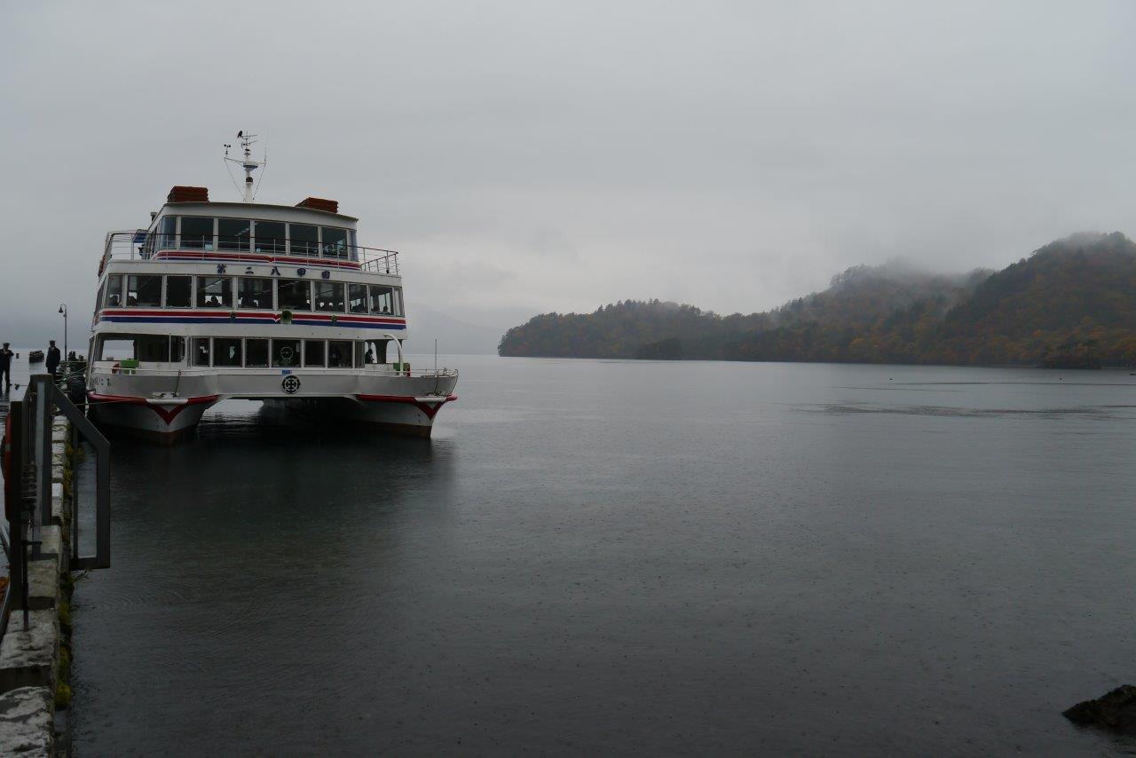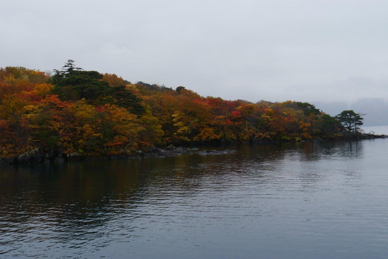 発荷峠はガスの中で十和田湖の全貌は見えませんでしたがここはライブカメラがあるので毎日みれますね。そして湖畔から遊覧船で湖上からの紅葉見物です。雨は降っていないので期待して出航です。