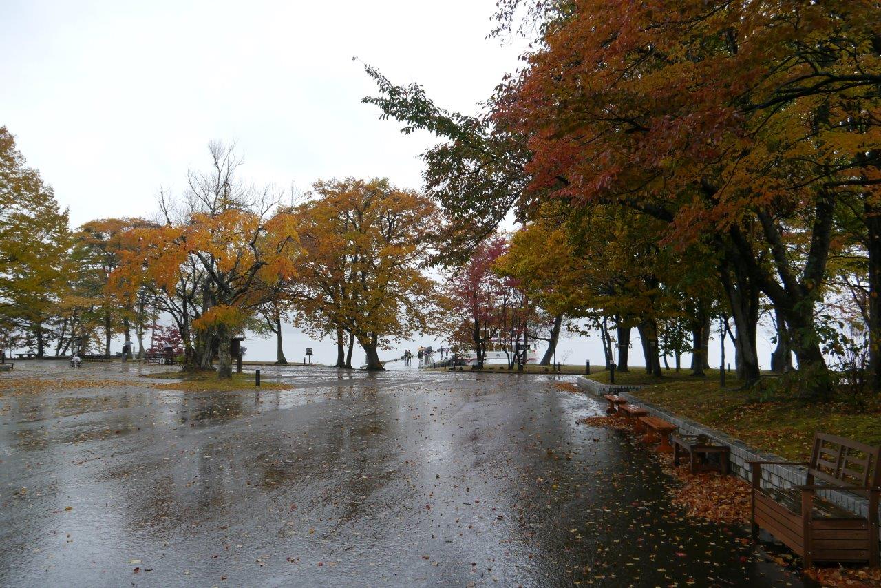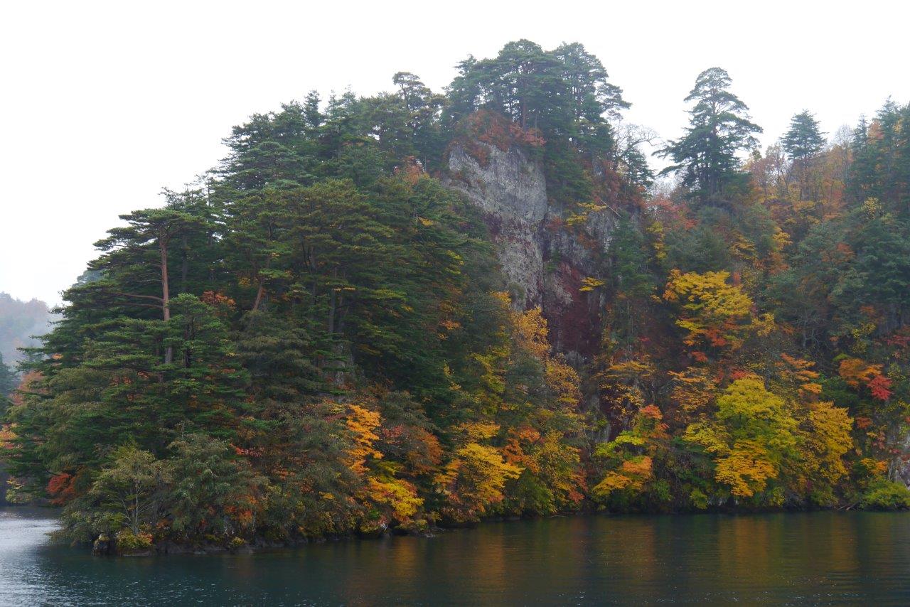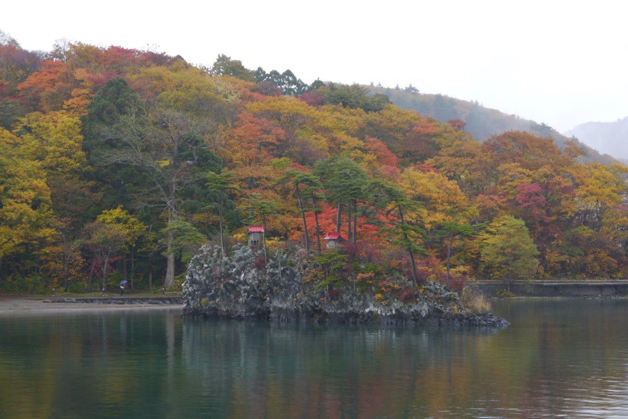 発荷峠はガスの中で十和田湖の全貌は見えませんでしたがここはライブカメラがあるので毎日みれますね。そして湖畔から遊覧船で湖上からの紅葉見物です。雨は降っていないので期待して出航です。