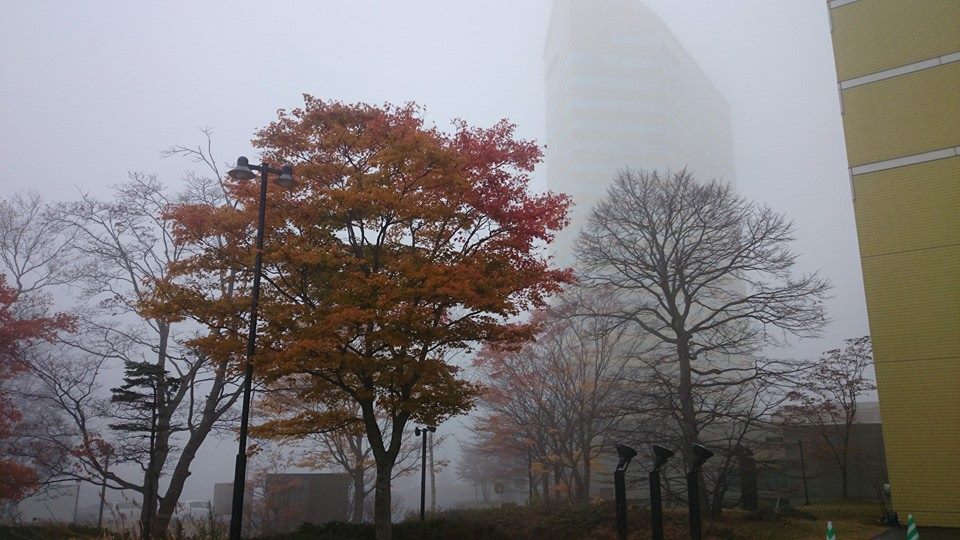 ガスでまわりは良く見えません。スキー場の中で紅葉も綺麗ですが残念です。