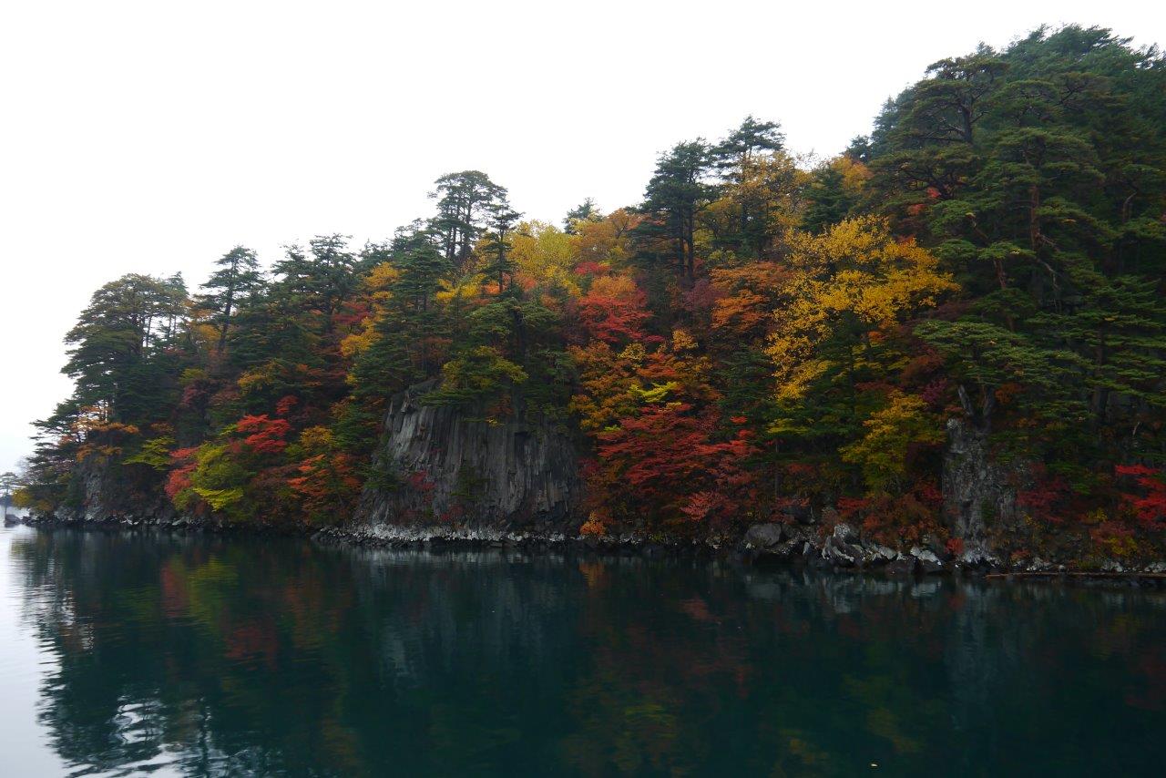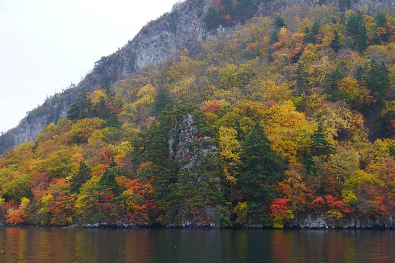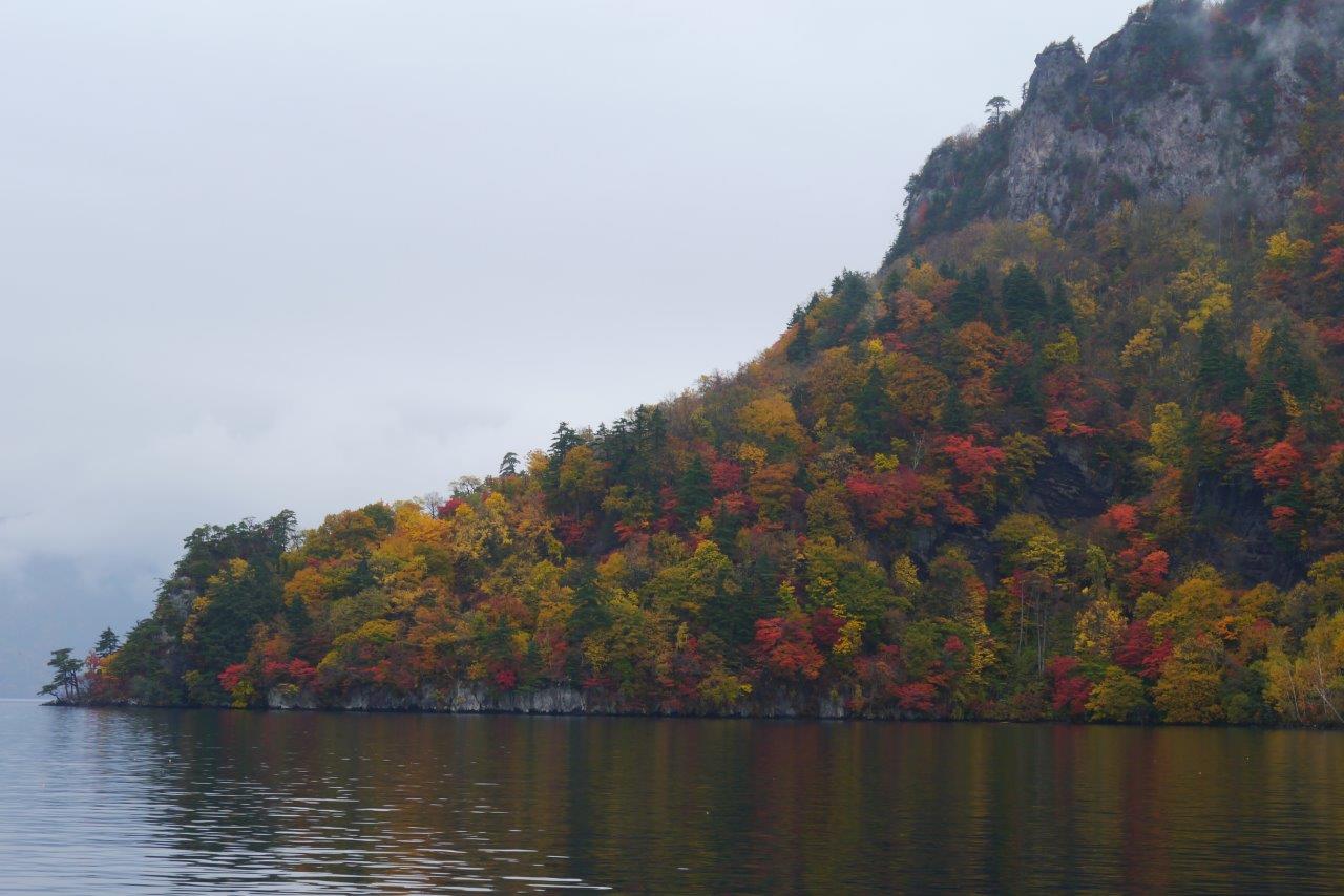 湖岸をゆっくり進む船上から錦織り成す紅葉を堪能しました。