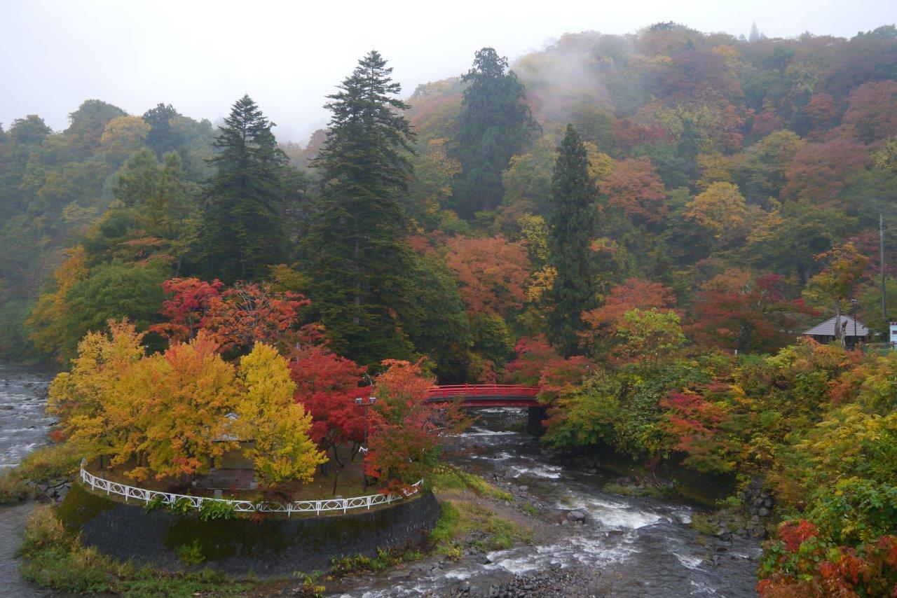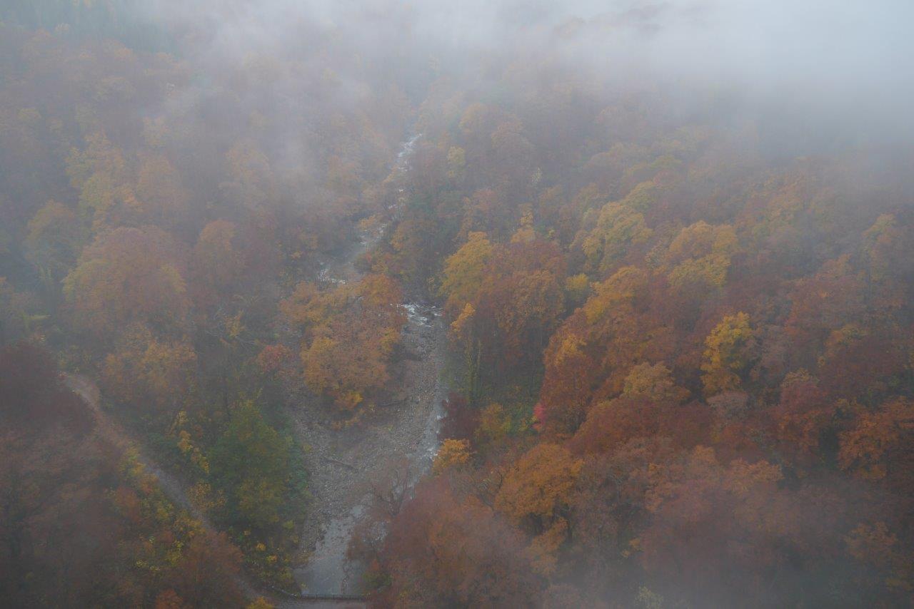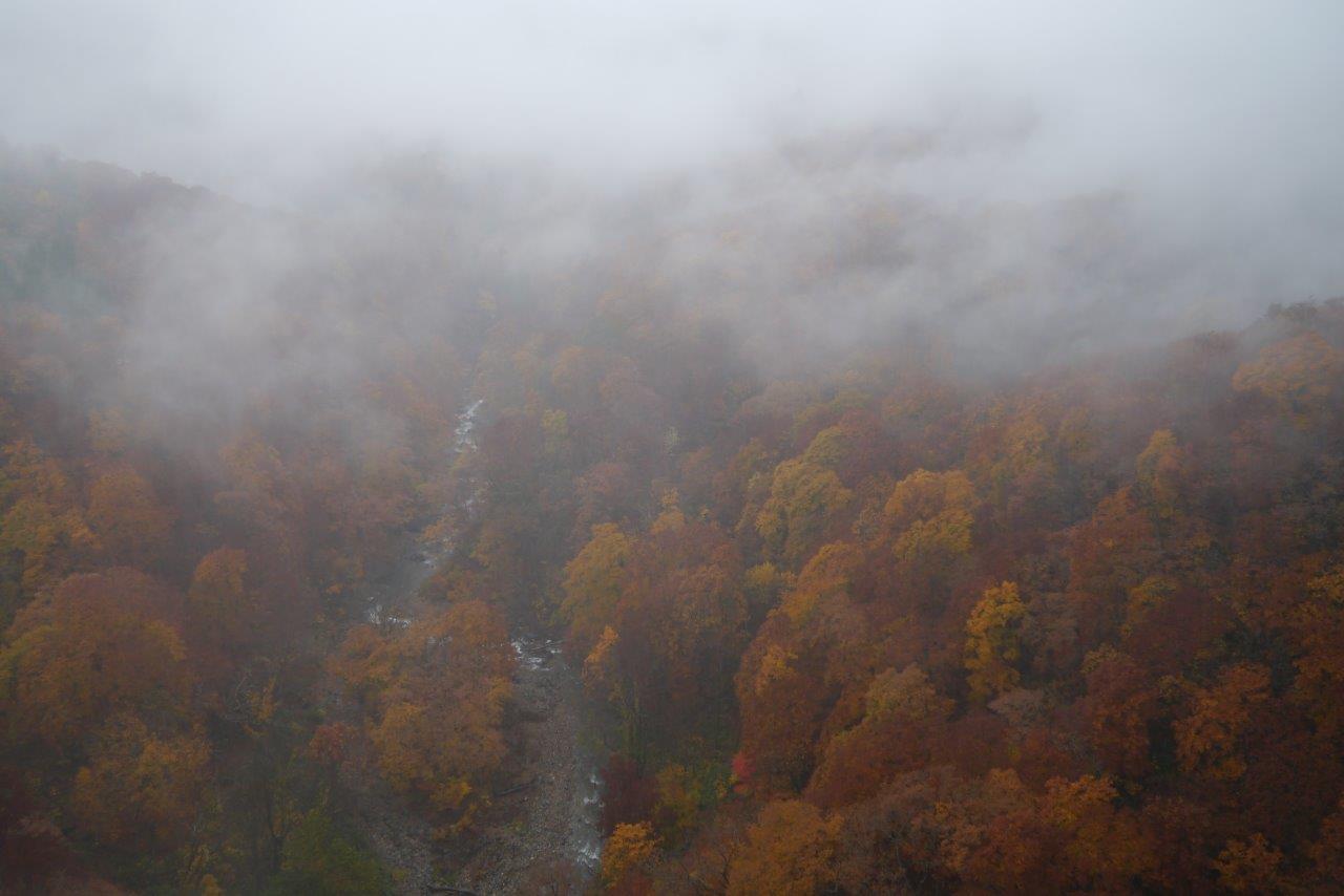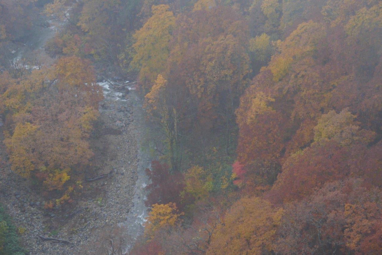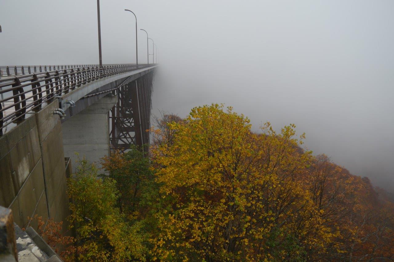 大橋を渡っている最中にガスが多少晴れて川が見えました。晴れていたら素晴らしい紅葉の景色が堪能できたと思うと残念至極でした。