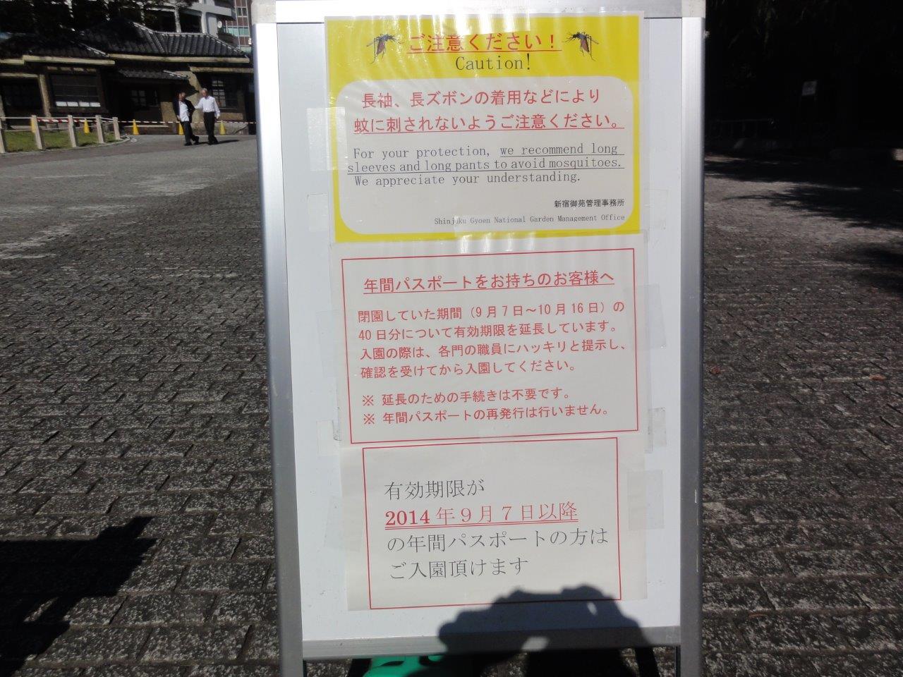 デング熱騒動で長らく閉演していた新宿御苑が17日に再開された。快晴にさそわれて早速お昼休みの散歩に出かけた。長袖・長ズボンで課に刺されないようにと注意書きがあり、私のような年間パスポートの人は40日間有効期限を延長するとお知らせが出ていました。