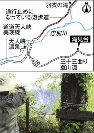 羽衣の滝は道内一の落差270mを誇る日本の滝百選の一つで、貴重な観光資源となっている。天人峡温泉から約600mの遊歩道を通ると間近で見られるが、2013年5月に土砂崩れが見つかり通行止めになっている。開通に向けた安全対策に取り組むんでいるが開通時期は決まっていないそうだ。そこで東川エコツーリズム推進協議会トムラウシ山への縦走路ともなる登山道を通り、忠別川の対岸にある「滝見台」から滝を見るツアーを企画し、33回曲がり角がある険しい山道だが、約500mの距離から羽衣の滝の上部が楽しめるそうだ。行程は約1.5kmで所要時間は1時間半程度なので便利ですね。このルートは旭岳と羽衣の滝、2つの『道内一』を楽しめるそうで例年になく紅葉も美しいそうなのでいってみたくなりますね。