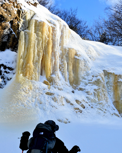 標高約1200m付近にあり、高さ約10m、幅約8mあり、硫黄分や鉄分を含んだ水が岩壁に染み出して凍り、赤黄色い滝のようになっている。