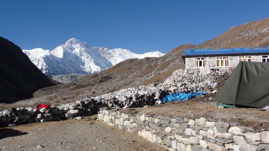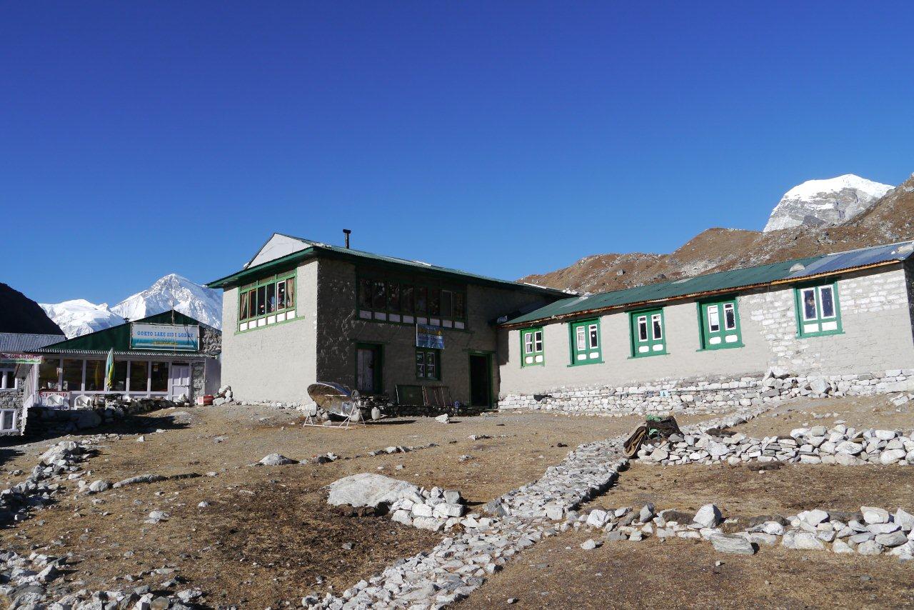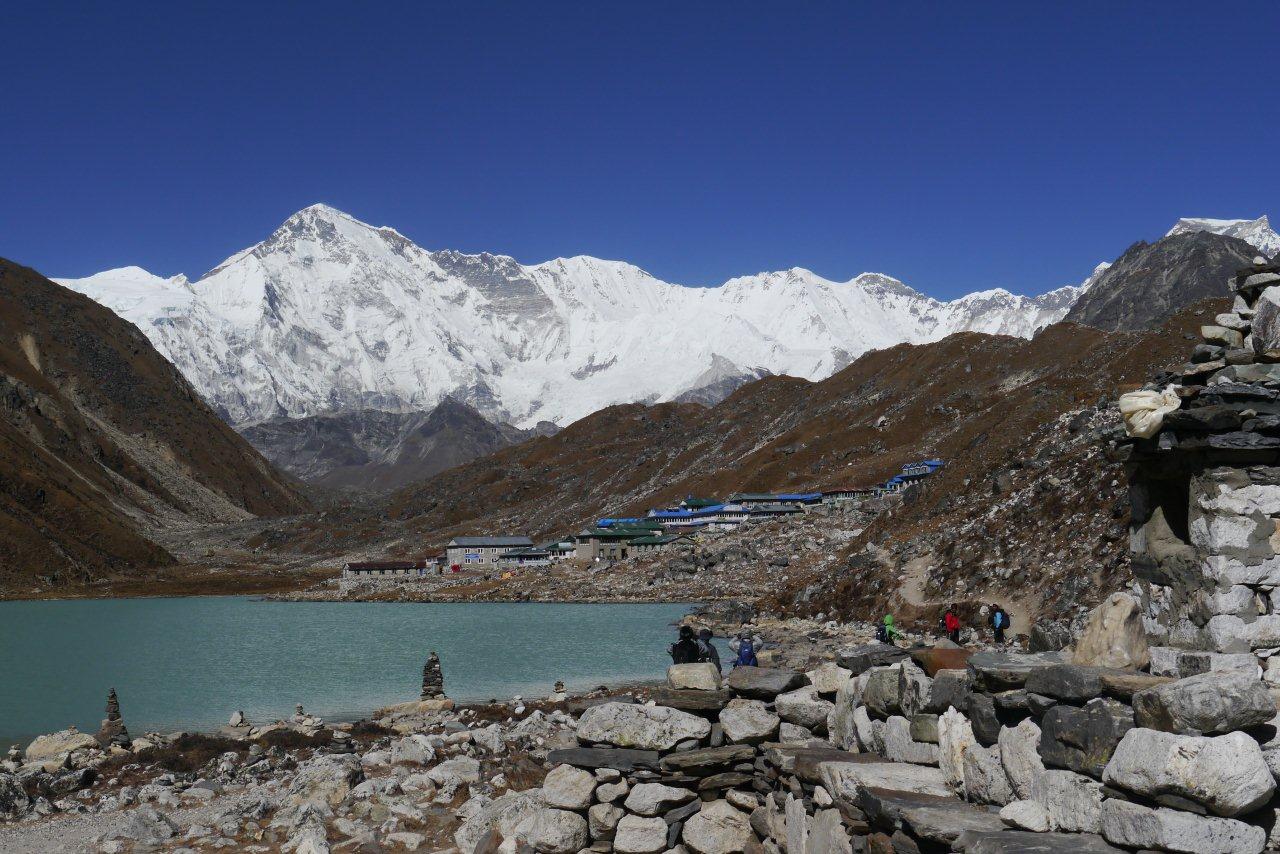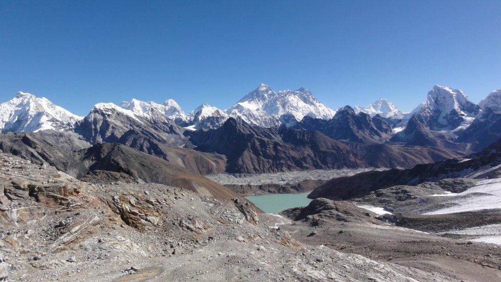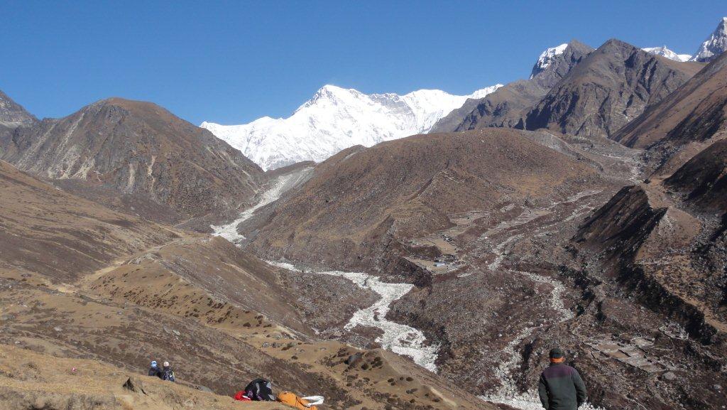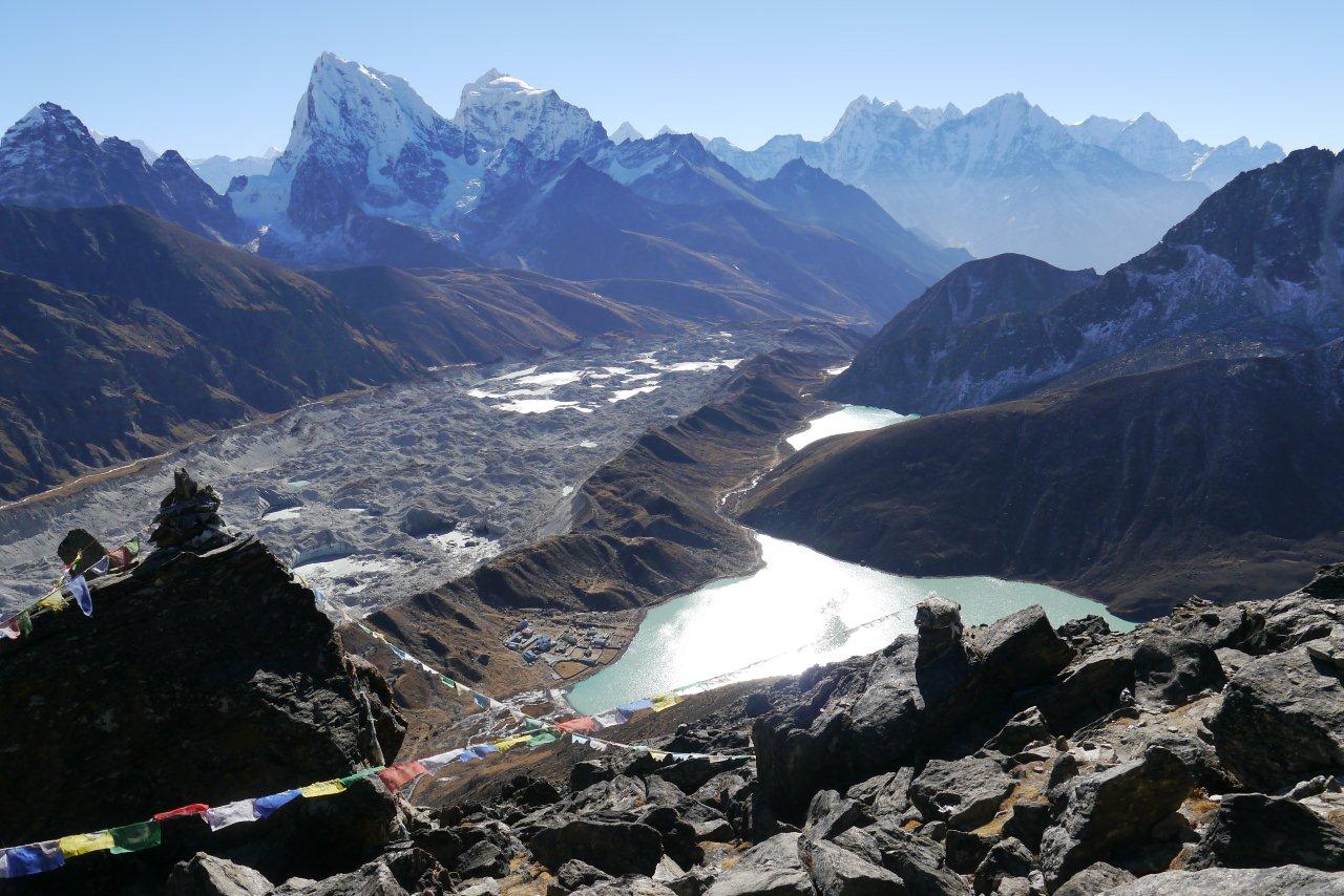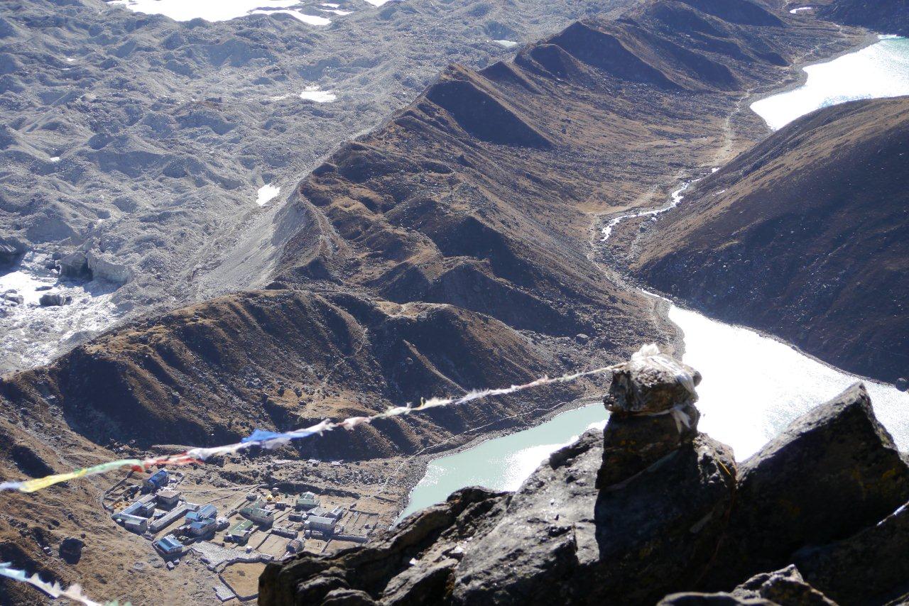 ゴーキョのロッジや氷河が見えます。よく登ってきました。