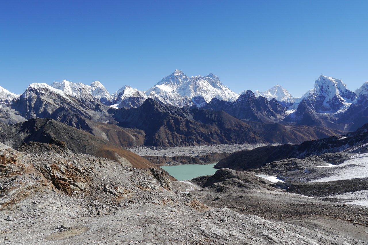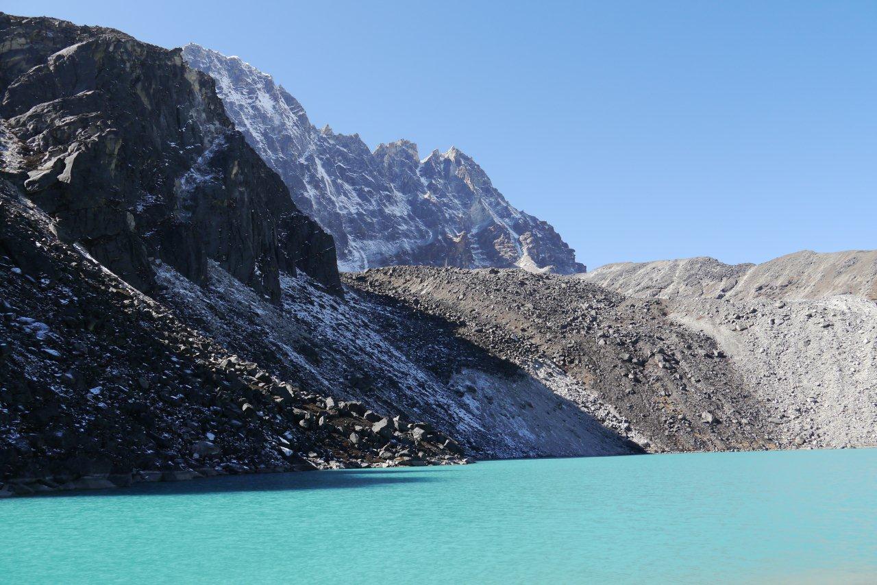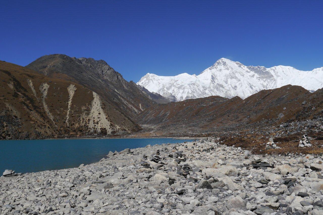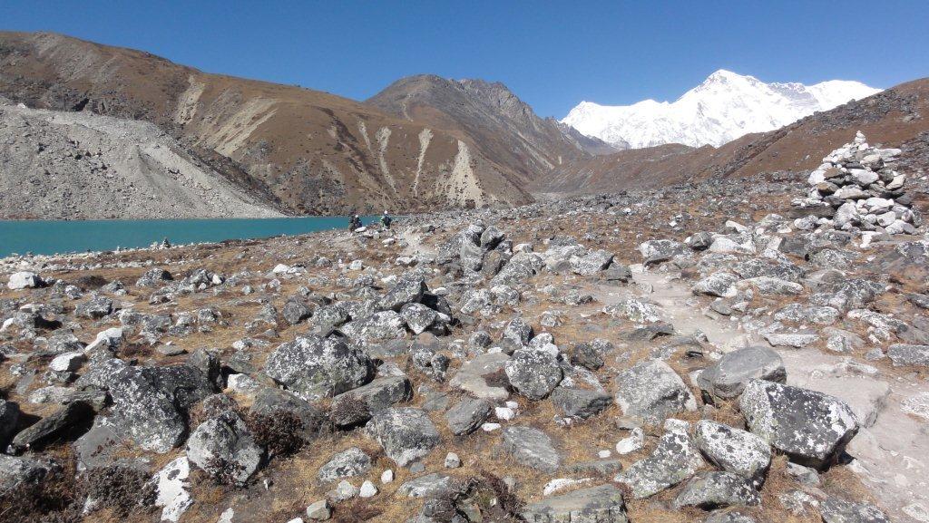 8日目11月16日はマッチツェルモ4410mからゴーキョ4750mまで約4時間の歩行です。ゴンジュバ氷河に沿った 道をゆっくり登っていきます。氷河の末端モレーンを登りきると氷河湖が現れ、チョ・オユーやギャチュンカ ンの山々が見えてきます。