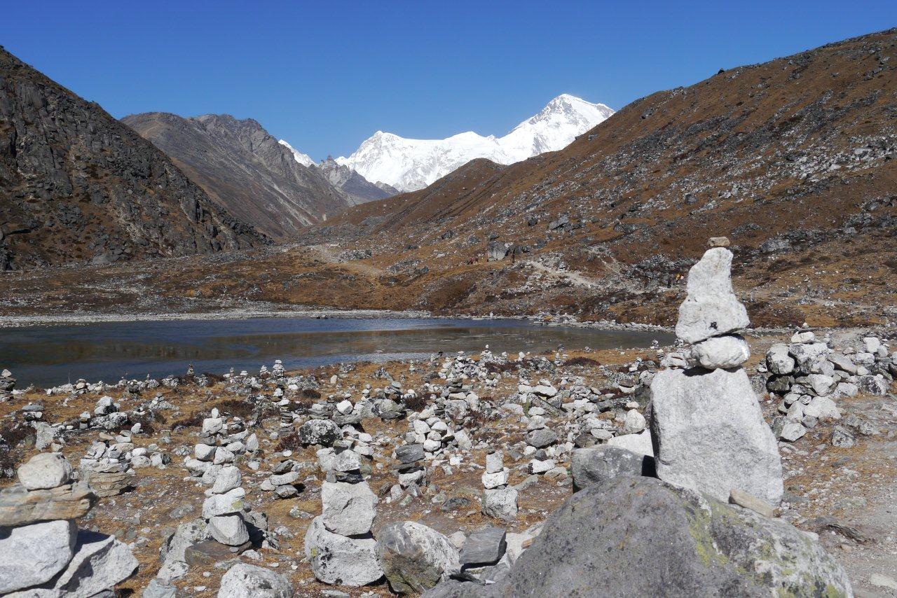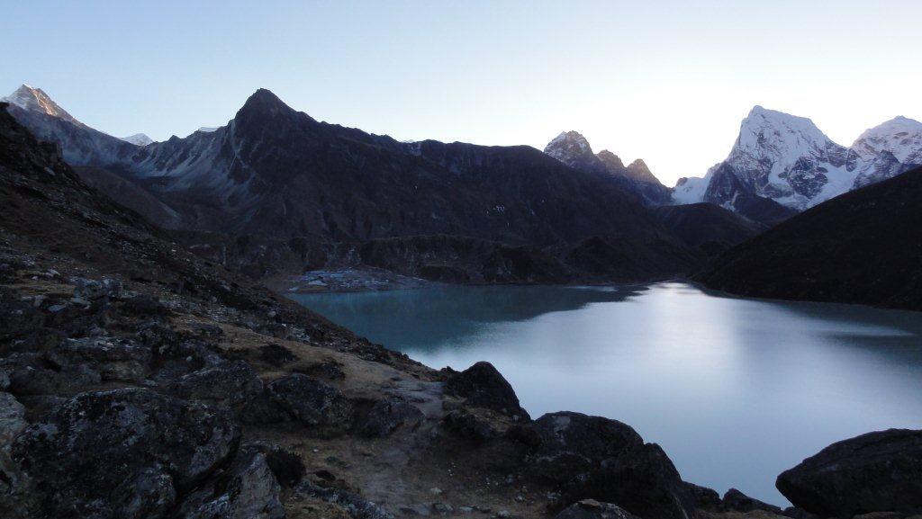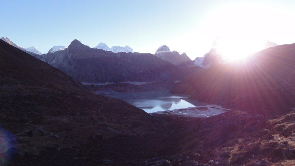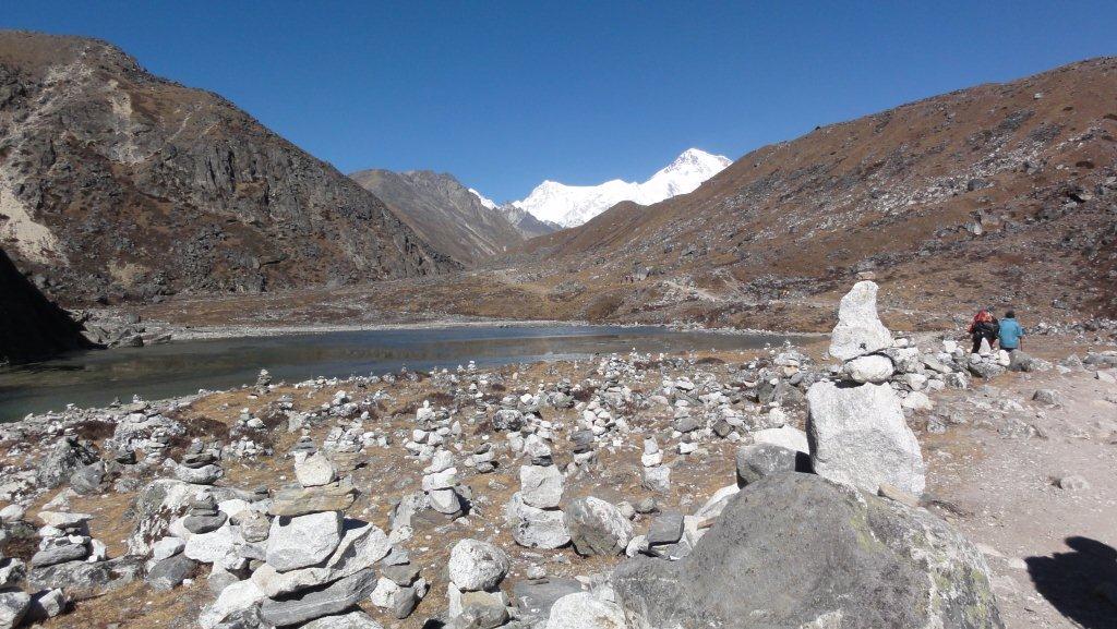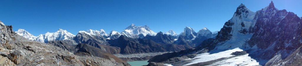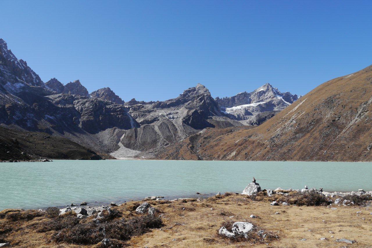 8日目11月16日はマッチツェルモ4410mからゴーキョ4750mまで約4時間の歩行です。ゴンジュバ氷河に沿った 道をゆっくり登っていきます。氷河の末端モレーンを登りきると氷河湖が現れ、チョ・オユーやギャチュンカ ンの山々が見えてきます。