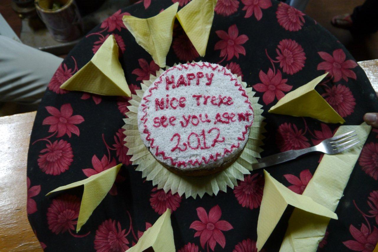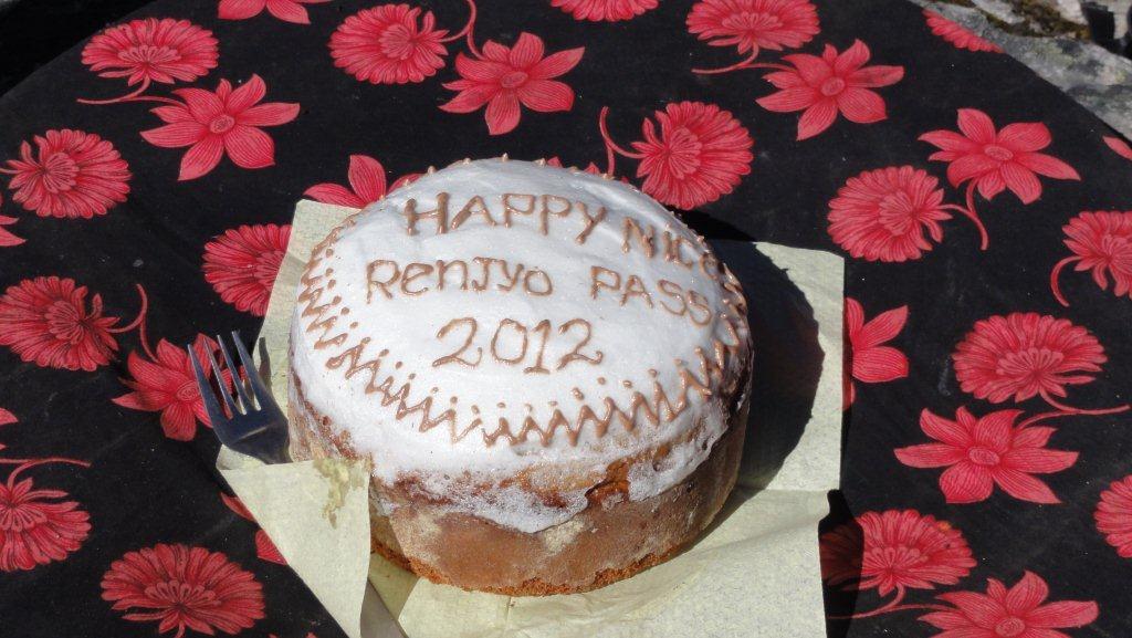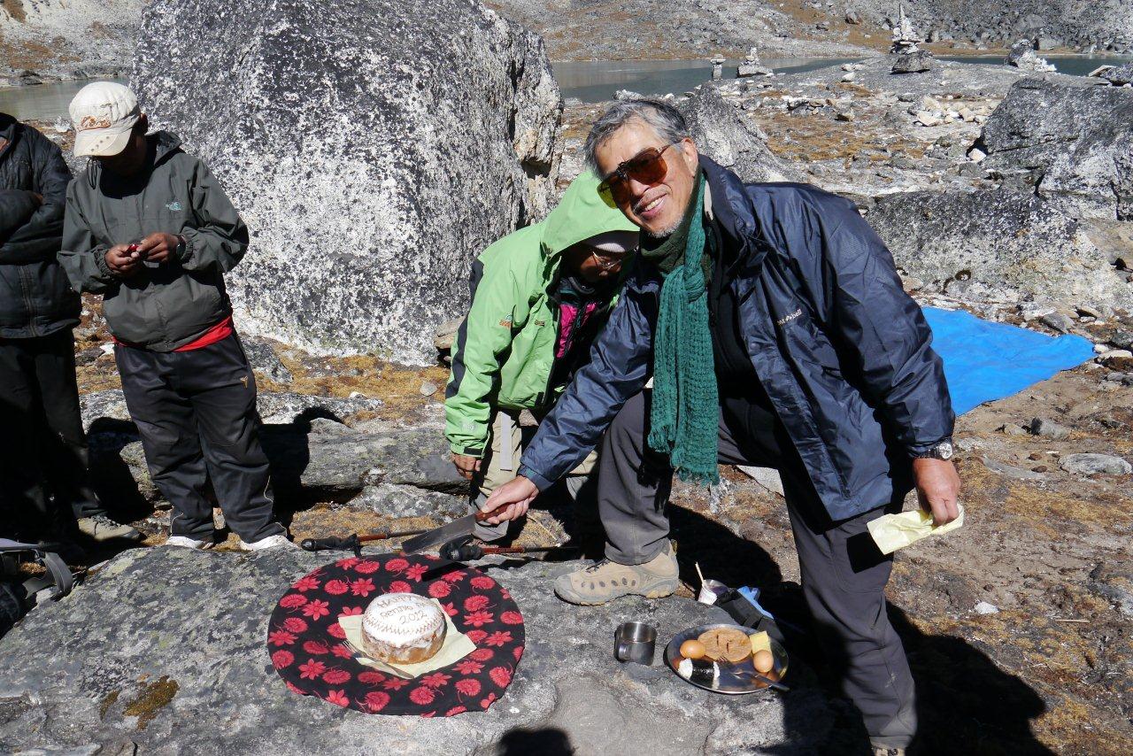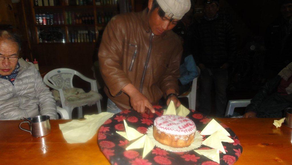 無事難関のレンジョパスを越えた記念にと作ってくれました。今回のトレッキング企画代表がケーキカット!!