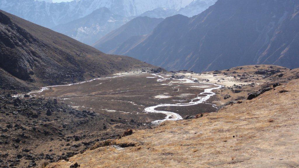 トレッキング10日目11月18日はゴーキョ4750mからレンジョ・パス5345mを超えてレルモポカリ4875m~ルンレ4290mへ下 っていきます。ゴーキョレイクの北端から山腹に上がり、岩の多い道をレンジョパスに向かいクーッブ山群の 絶景を堪能します。その後はどんどんと下って生きます。歩行時間はこのトレッキング中一番長い7時間です が下っていくので問題ないでしょう。そして明日の歩行を楽にするためルンレ村を通過してマラルン村4200m まで降りましたまたまたGPSの電池切れですがレンジョパスを越えたところまでのログは取れてますので証拠 になりますね。