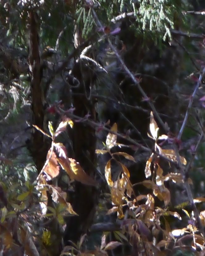 リーダーのガイドがカモシカが横切ったと谷のほうを見ています。基の写真ではわからなかったのですが拡大して良く見たら写っていました。目、鼻、足がわかるでしょ。こちらを向いていましたが警戒心が強いそうでなかなか写真に取れないそうですがラッキーでした。