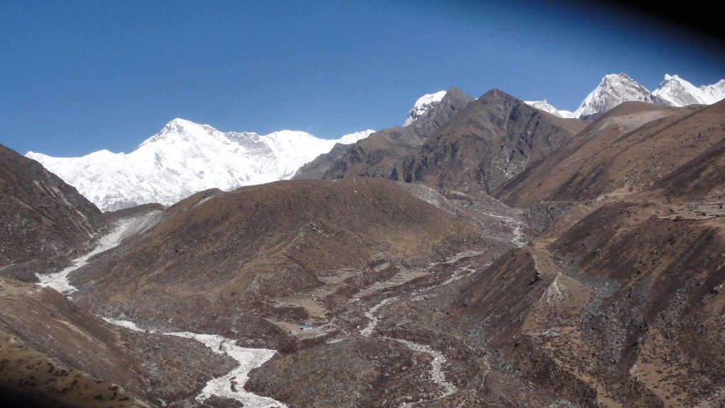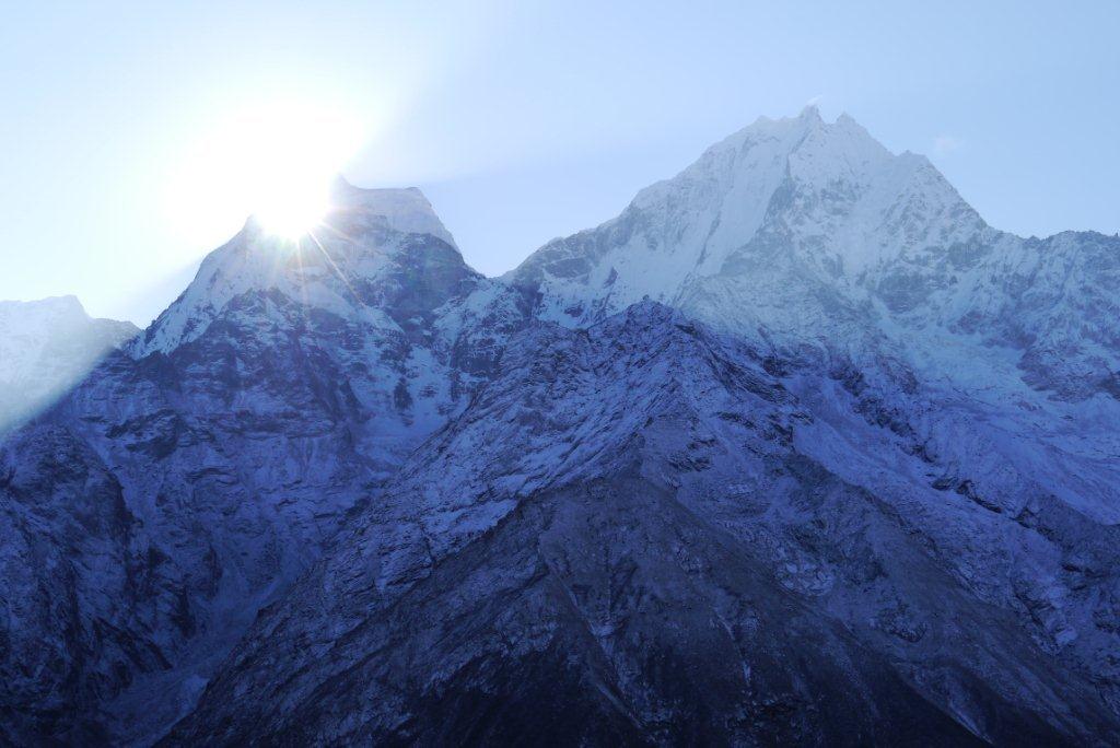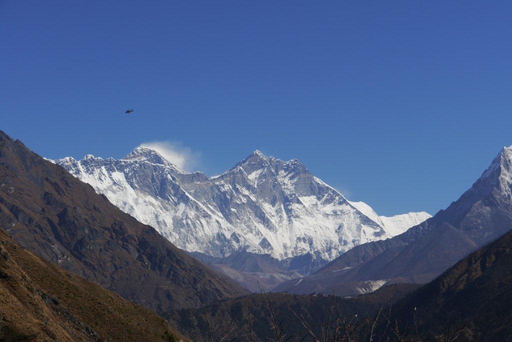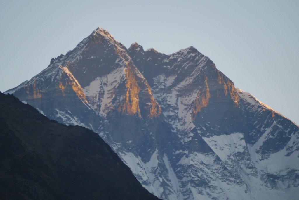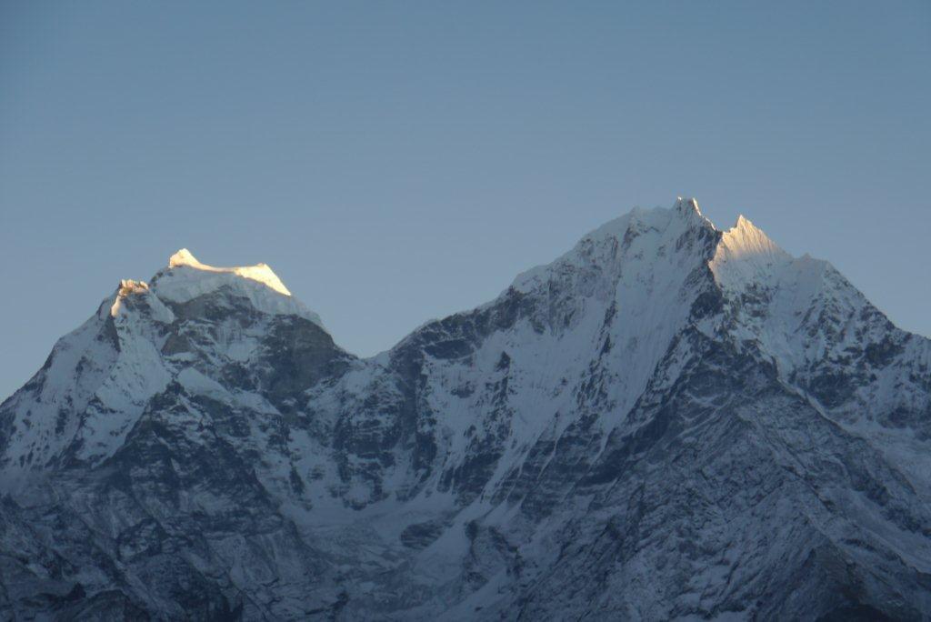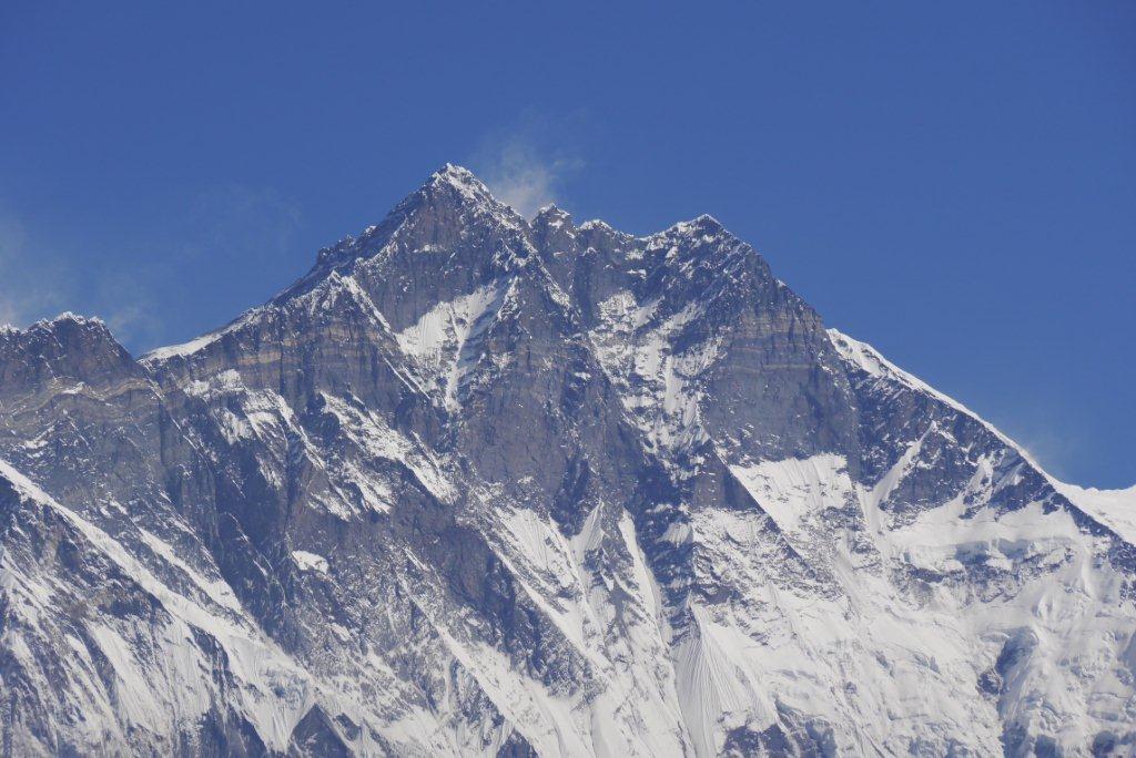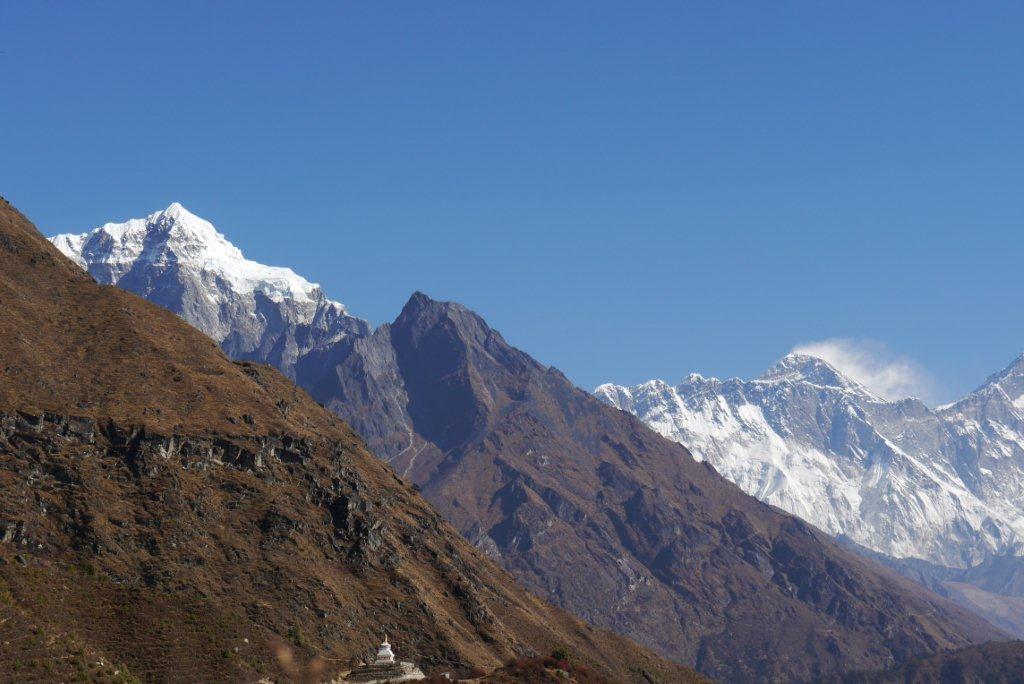 右の山がローッエでその奥の左の雪煙がでているのがエベレストです。