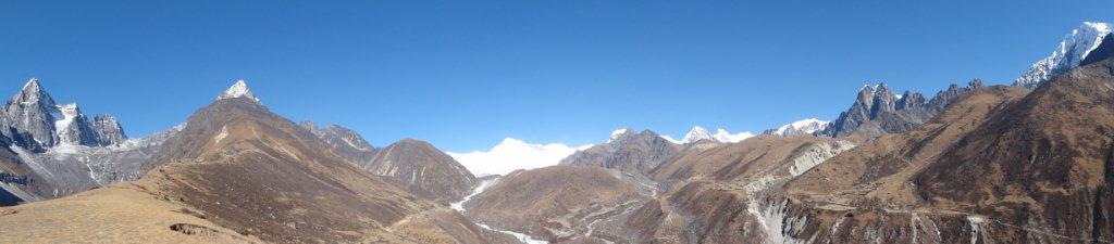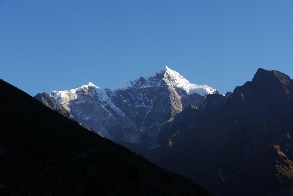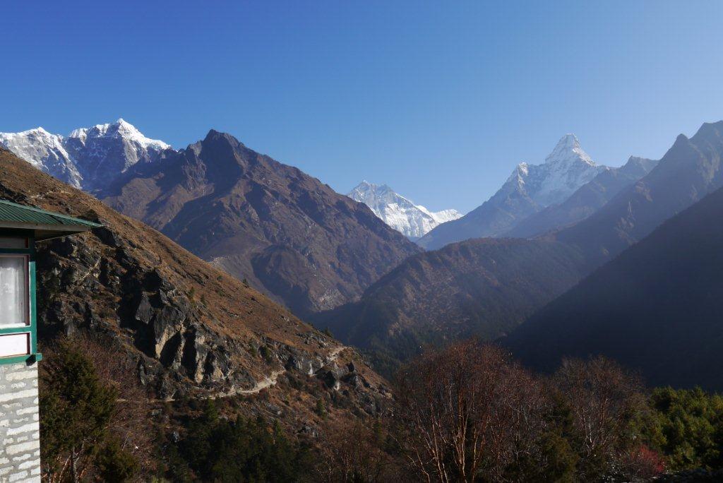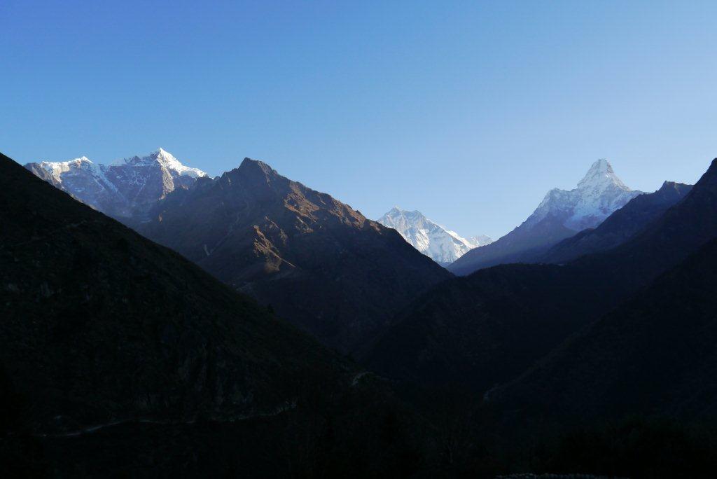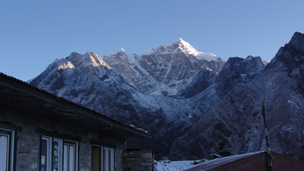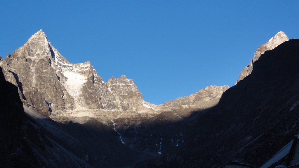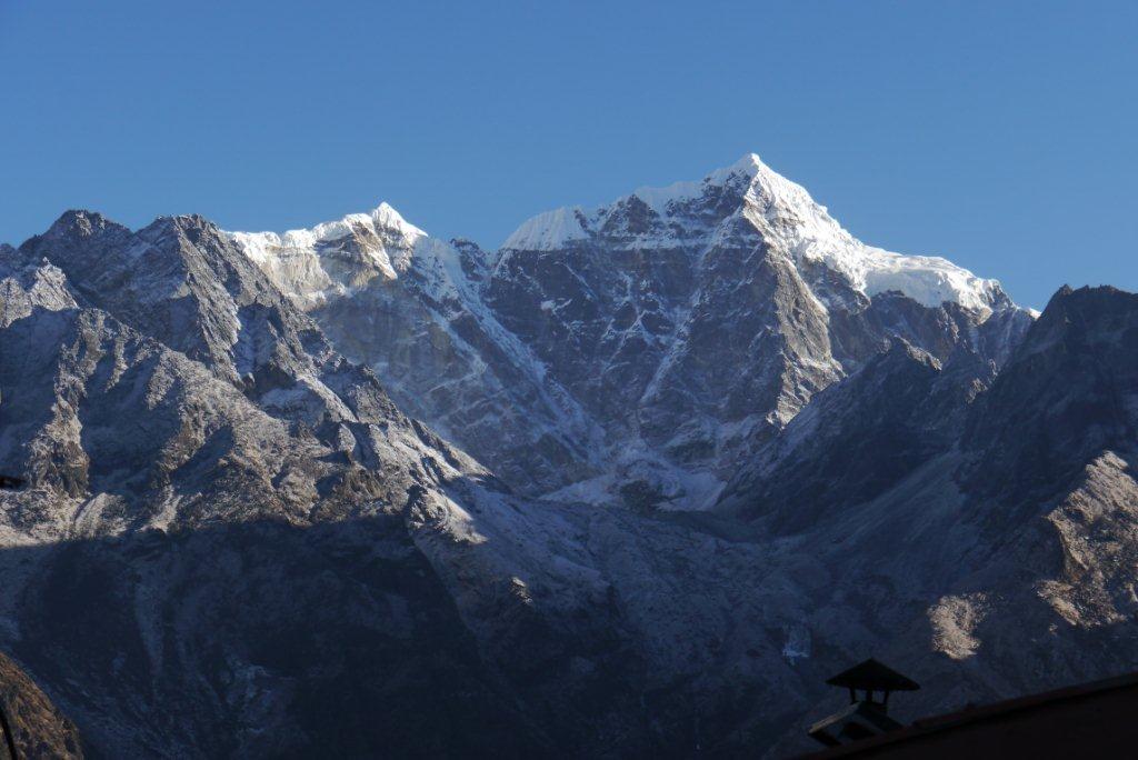 右の山がローッエでその奥の左の雪煙がでているのがエベレストです。