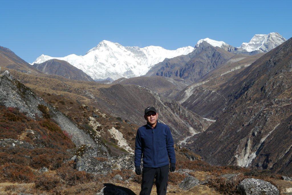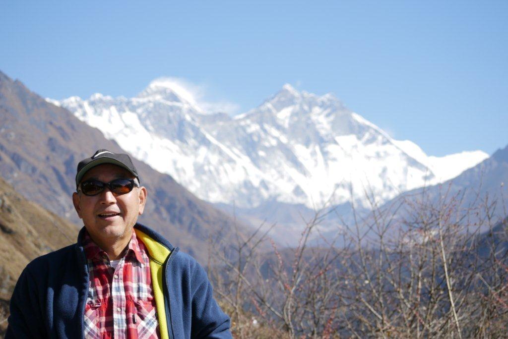 エベレストを背景に記念撮影です。