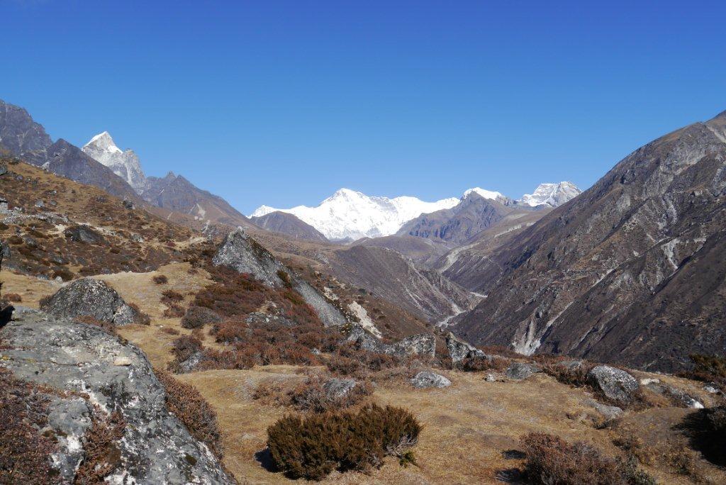 6日目11月14日はドーレ4040mからマッツエルモ4410mまで歩行時間4時間です。樹林帯を抜けて草地になった歩きやすい登山道を登っていきます。いよいよエベレストが見えるところへ近くなってきました。高地順応のためにマッツ