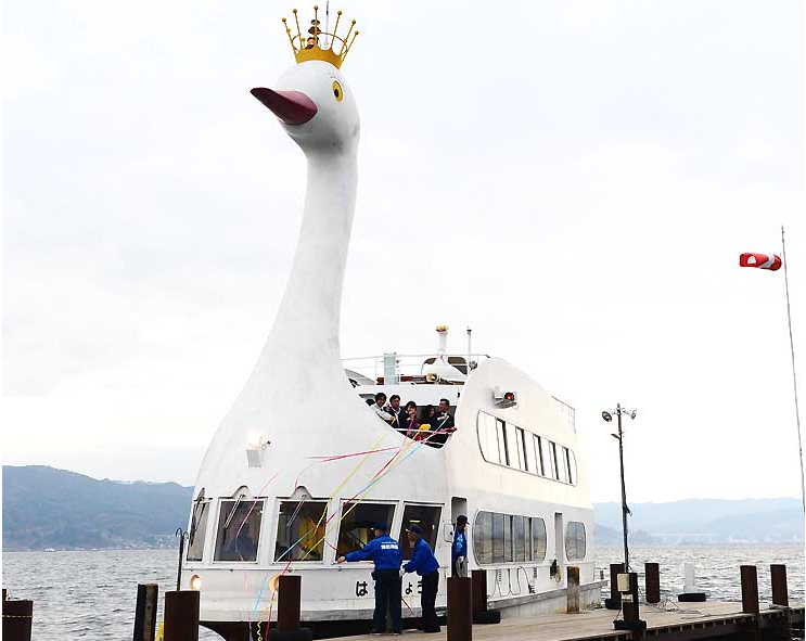 1991年の就航以来、26年にわたって諏訪湖の観光客を楽しませてきた大型遊覧船「おやこはくちょう丸」が11月30日に乗客の減少などから運航を終えた。最終便の乗客はデッキから桟橋に色とりどりの紙テそうだープを投げ、別れを惜しんだそうだ。