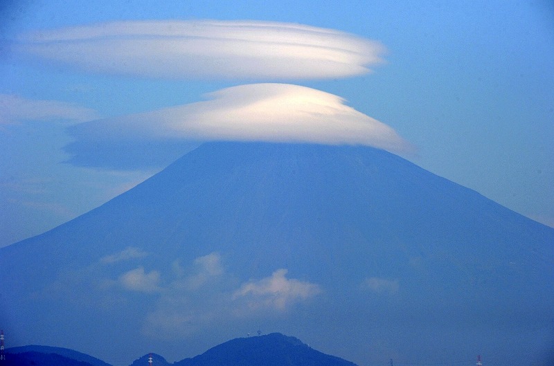 写真は2011/10/26の静岡新聞に掲載された富士山の笠雲だ。富士山の山頂付近をすっぽりと覆うように複数の段となった笠雲がかかって いるのが10月25日午前、静岡市内から見えたそうだ。笠雲は南西や西南西からの湿った空気が山にぶつかって上昇し、上空で冷やされて できるが今回は上昇気流が強かったため、雲が積み重なったとみられている。静岡市中心部からも青空を背景に幾重もの笠雲が見られた そうだがなかなか重なったのは見れないですね。