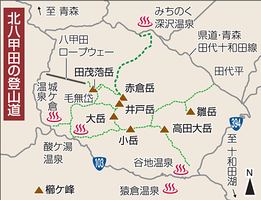 そして今年は9団体がボランティアに参加して北八甲田のすべての登山道を網羅する形で刈り払いを行い、コースを充実させるようだ。このうち県道・青森田代十和田線(田代平側)のみちのく深沢温泉近くから赤倉岳を目指す登山道は、八甲田で最も標高差があるコースとして知られてきたが、荒廃したままで「廃道」としている登山地図もあり、県勤労者山岳連盟が早ければ今月中旬にも刈り払いを行い、最後まで手つかずだった登山道を復活させるようだ。谷地温泉から高田大岳山頂へ向かう登山道や、田代平から高田大岳と小岳の鞍部を目指す登山道も藪化が著しい状態だったが、高田大岳の登山道は十和田山岳振興協議会がボランティアで刈り払いを実施しかつての登山道がよみがえったようだ。田代平から高田大岳と小岳の鞍部を目指す登山道も青森市が刈り払いを行った。今年の作業が終わると、北八甲田の登山道はすべて復活し、登山者は田代平側から入山して酸ケ湯や城ケ倉、谷地温泉側に下山するなど、変化に富んだコースを選ぶことができるそうなのでうれしいですね。
