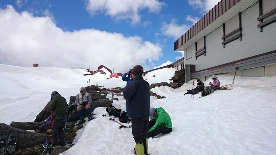 肩の小屋で昼食です。しかし、山頂付近にガスがかかってきたので今回はここまでで下山することにしました。何回もきているので無理はしません。スキー・スノボの若い人たちは山頂目指して登っていきました。大雪渓も雪がたくさん積もっているので楽しいでしょうね。私は10年前くらいに滑りましたがもうやめておきます。