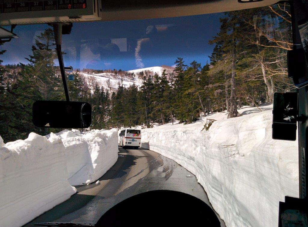 バスが高度を上げていくと雪の壁です。そして位ヶ原小屋で下車して登山開始です。