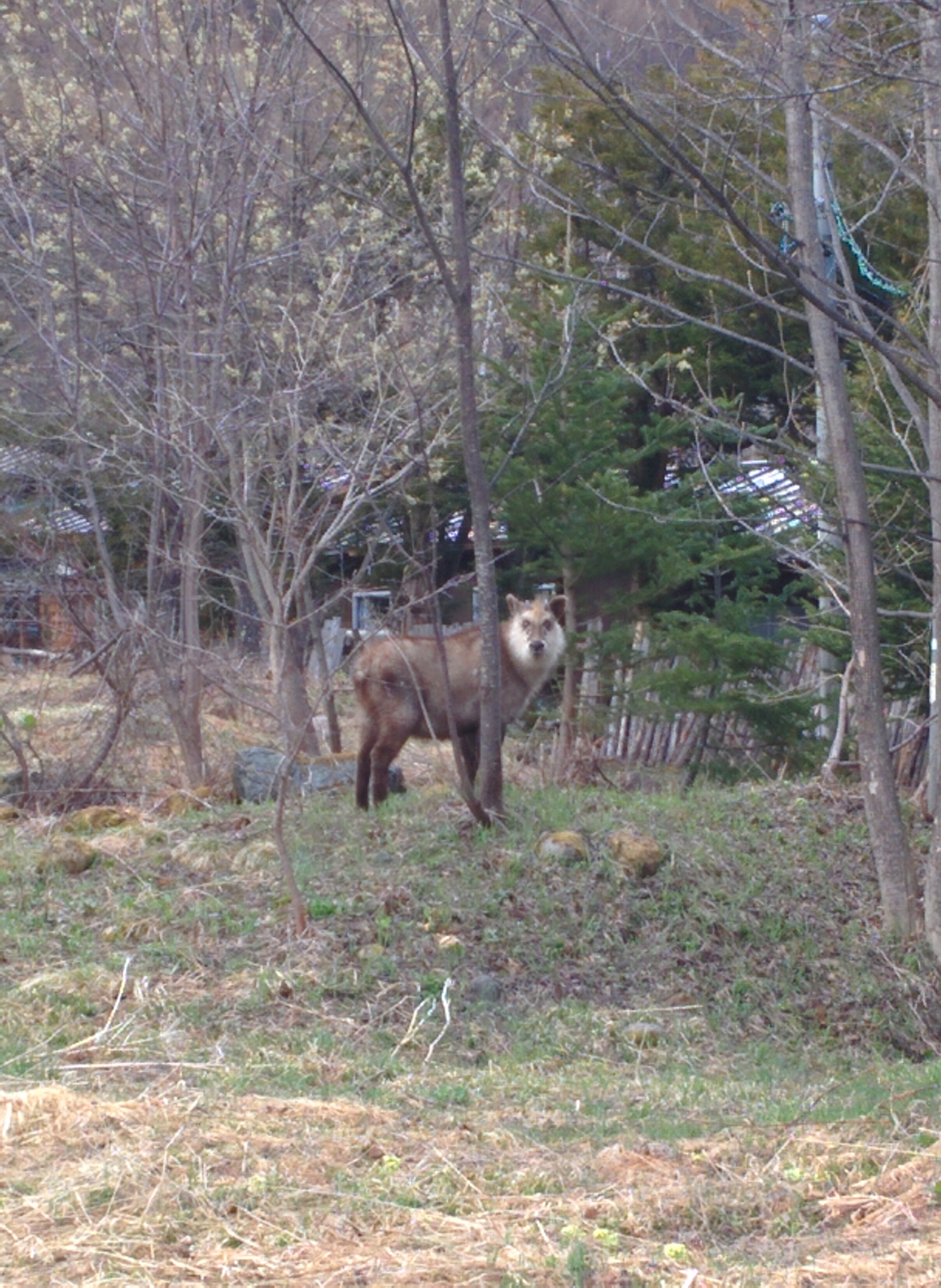 翌日6日朝起きたら、宿の前にニホンカモシカがいました。人との距離を保ってこちらをじっと見ていました。新芽が出てきておいしいエサが食べられるようです。