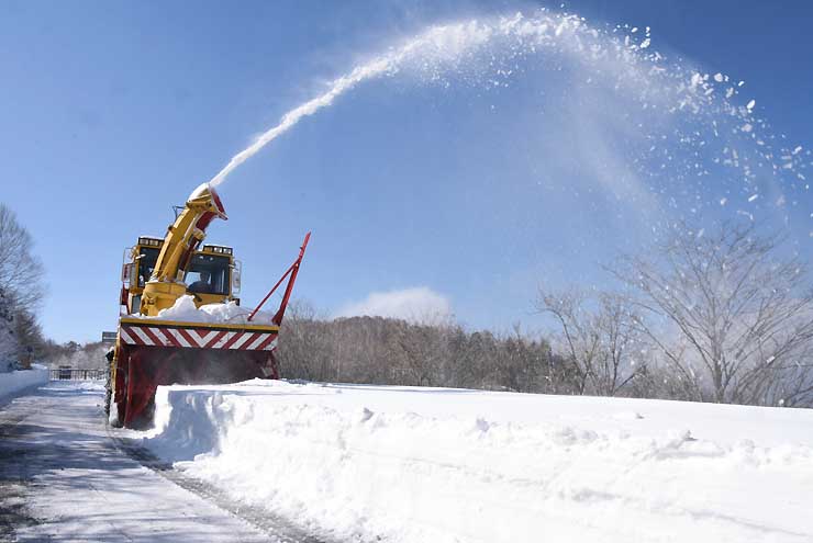 長野県諏訪建設事務所が冬季閉鎖している管内の国道、県道の除雪を進めているが、ビーナスラインの一部の県道霧ケ峰東餅屋線の八島高原駐車場~和田峠間4.7kmで、ロータリー除雪車が青空に弧を描くように雪を吹き飛ばしている。