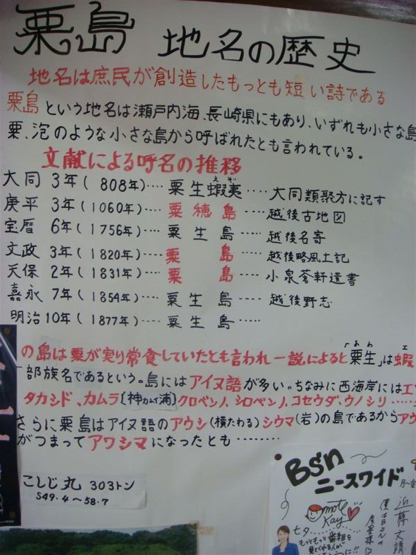 まづ、島の名前の由来が宿の壁にはってありました。この島は蝦夷の範疇であったのか地名などアイヌ語が多いようです。写真 を拡大してみてください。なるほどと思いますよ。