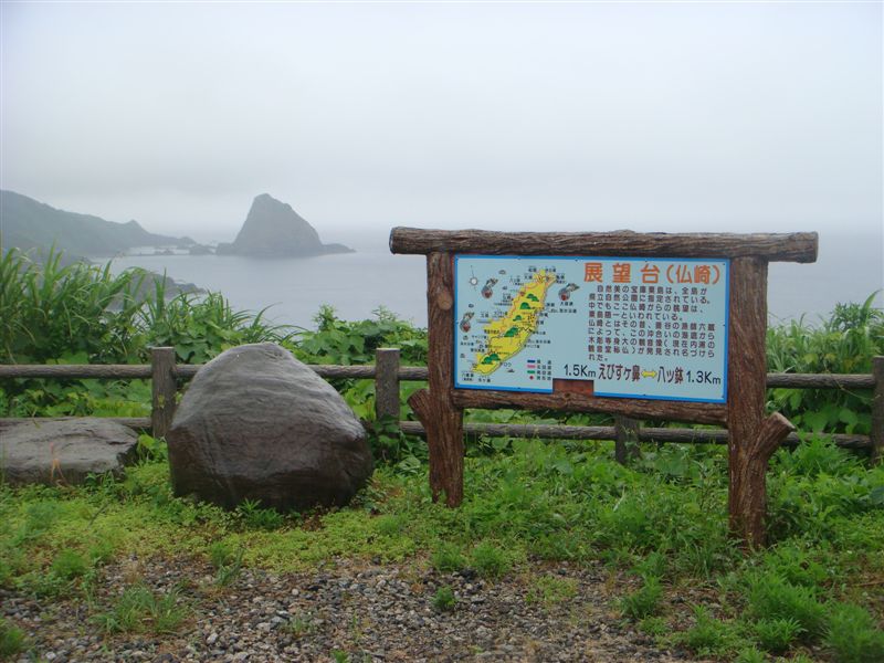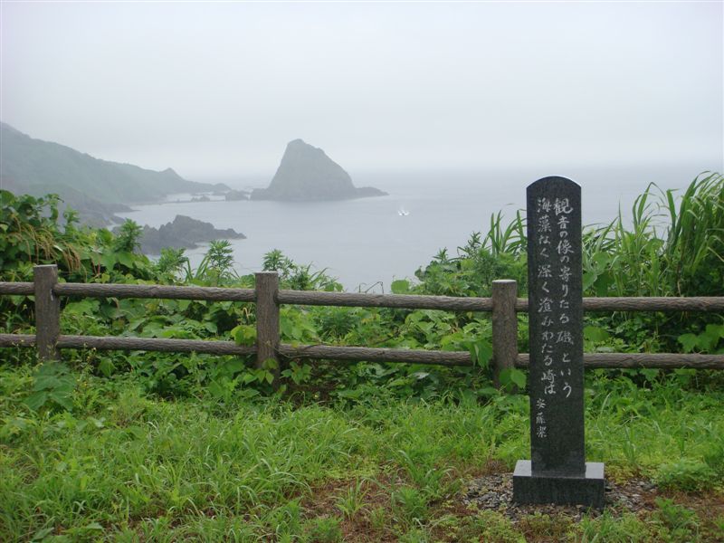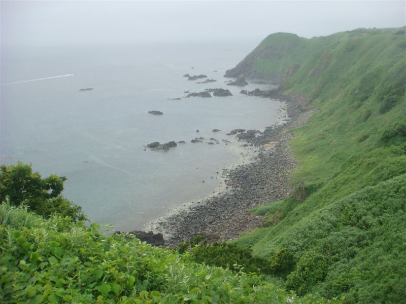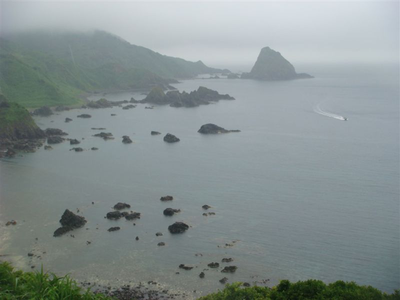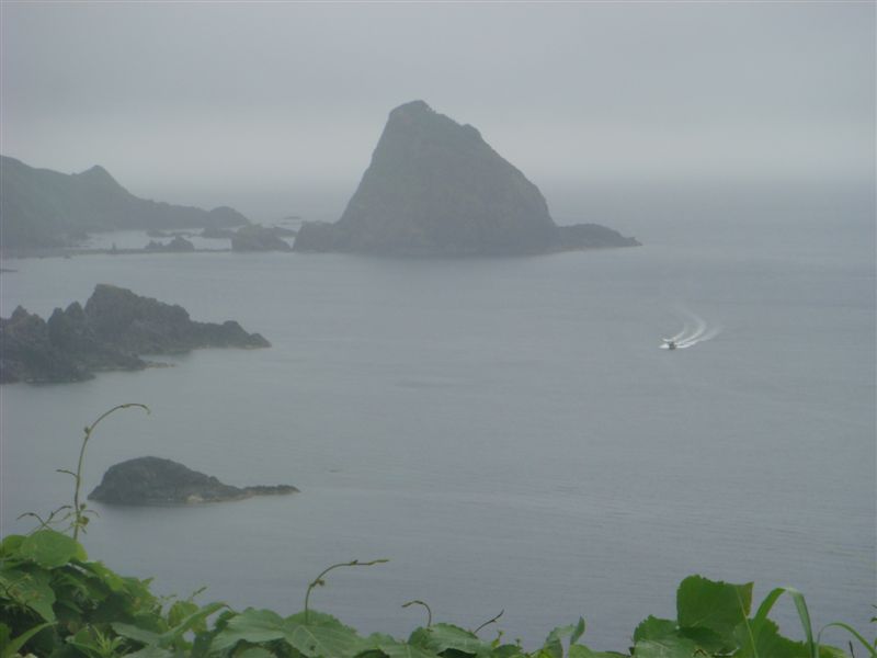 そして会長の計らいで、今回粟島初めてだろうからと同乗していた5人で車で島を見学した。雨で見晴らしは悪く島の峠から何 も見えませんでした。今年春に作り始めた遊歩道もだいぶ草に覆われだしていますが大丈夫でしょう。道はしっかり付いていま した。そして海岸のビューポイントに行くと雨で多少かすんではいるもののとてもよい景色が堪能できました。