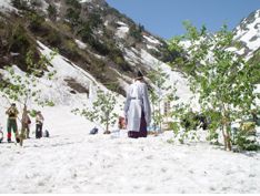 北アの針ノ木岳慎太郎祭をご存知だろうか。針ノ木岳(2821m)に山小屋を整備し、山案内人組合を作った大町市出身の百瀬慎 太郎(1892~1949)の功績をたたえ毎年「針ノ木岳慎太郎祭」が開かれているのだ。山岳関係者ら約250人が、標高約1800m付 近の雪渓上で安全祈願をした後、全員で「雪山讃歌」を合唱後、標高約2500mの針ノ木峠を目指す記念登山を行い約100人が残 雪を踏みしめて雪渓を登ったようだ。