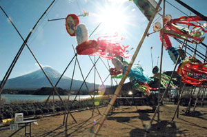 富士河口湖町大石の大石公園で2つのイベントが行われている。1月17日までの「冬の七夕まつり」と光のナイアガラ&ウェイブ(1月31日まで)です。(イベント情報はこちら)冬の七夕は大石観光協会が正月のイベントとして始め、今年で5回目で河口湖畔に色とりどりの吹き流しが飾り付けられており富士山を背景になんともいえない感じですね。また、短冊や絵馬に願い事を書いて、ササにつるすこともできるそうですよ。