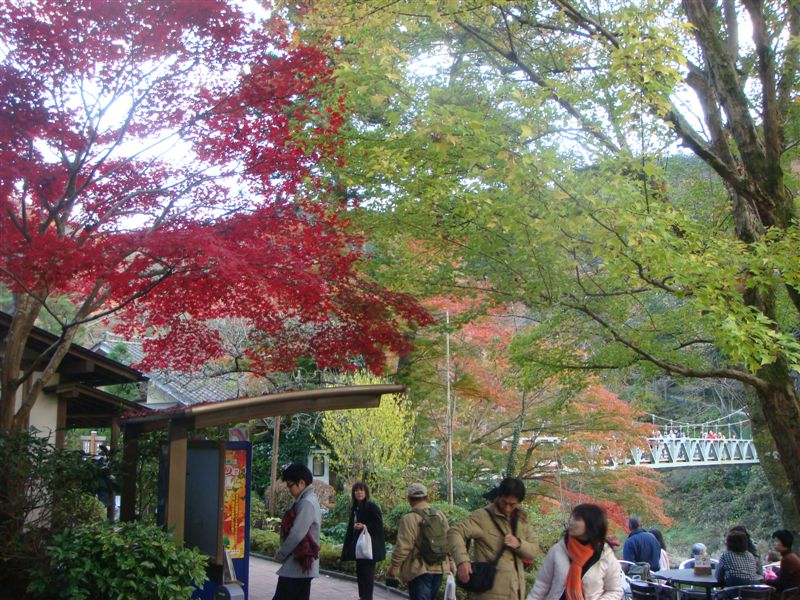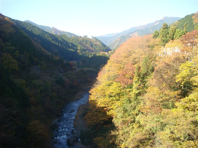 紅葉真っ盛りの御岳山に21日(土)に行ってきました。快晴無風の暖かな小春日和の中紅葉を満喫してきました。古里駅で降り、9:50に橋を渡って登山口に向かいます。渓谷もちょうど見ごろです。