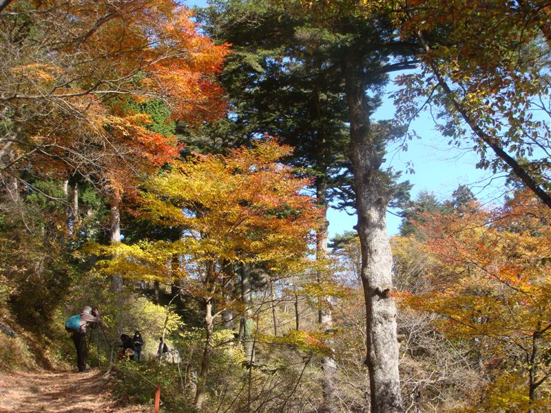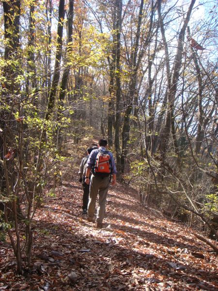 尾根に出ました。ナラ、クヌギなどの黄葉樹は葉がだいぶ落ちて枯れ草を踏んで進んでいきます。