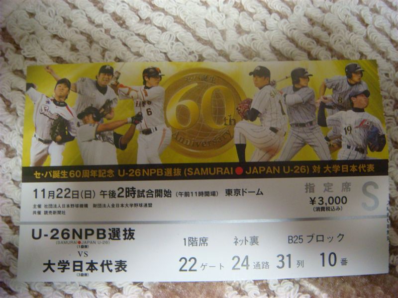 21日に行われたU-26NPB選抜(プロ)対大学日本代表のチケットが抽選で当たり、席を見たらバックネット裏のとても良い席だったので観戦に出かけた。